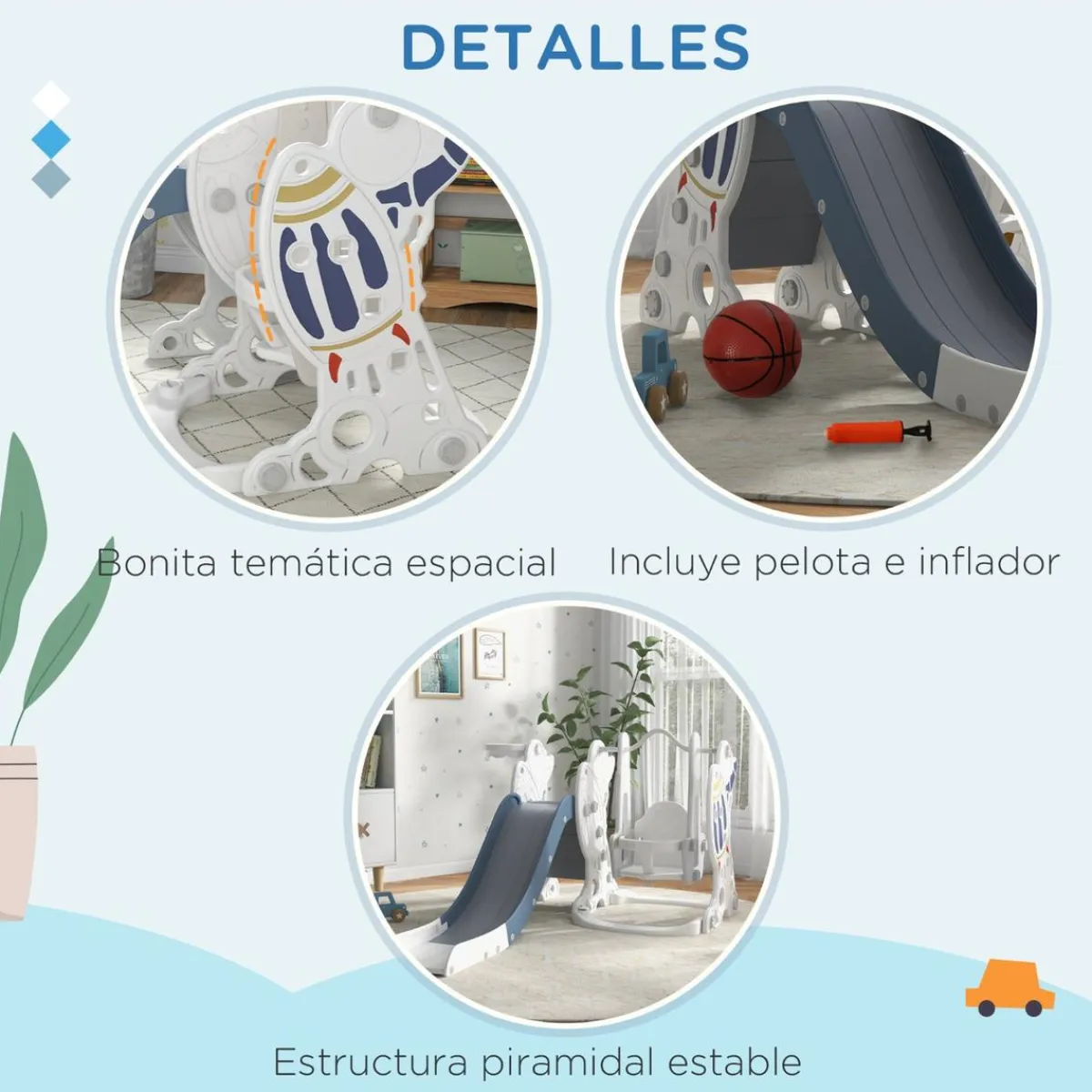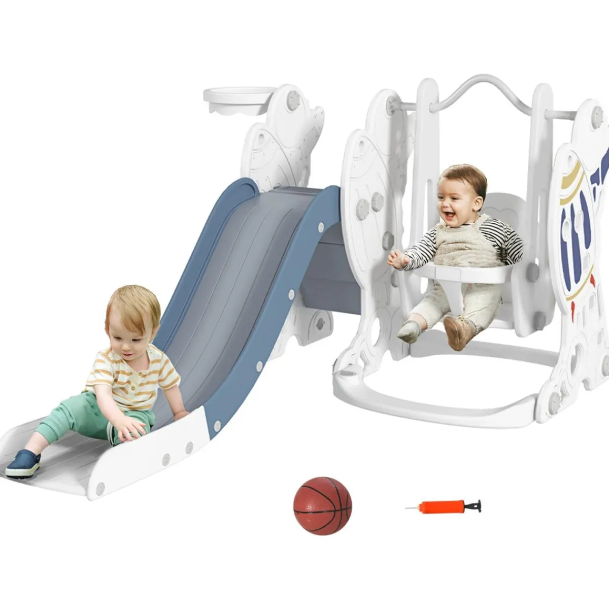 - 3 en 1, compuesto por tobogán, columpio y canasta de baloncesto