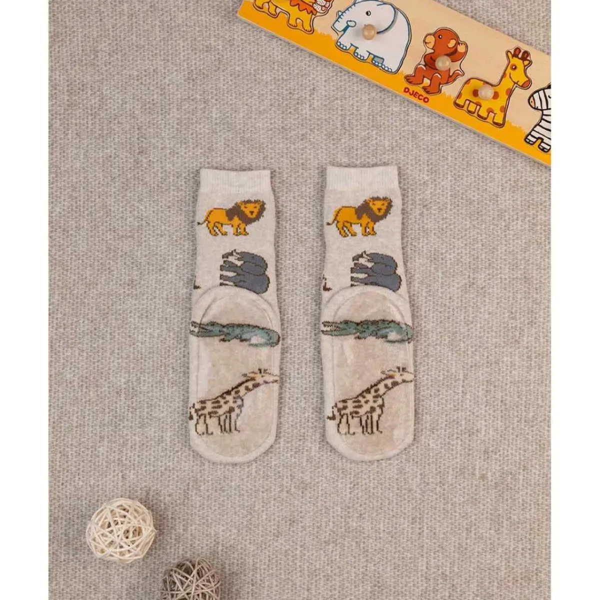 Prácticos antideslizantes para niño. La prenda se desarrolla totalmente en beige con bordados decorativos con tema de sabana en la parte superior. El ajuste es holgado y garantiza cero molestias, los gomitos garantizan estabilidad. Accesorios no a la venta. El paquete contiene solo la prenda de vestir
