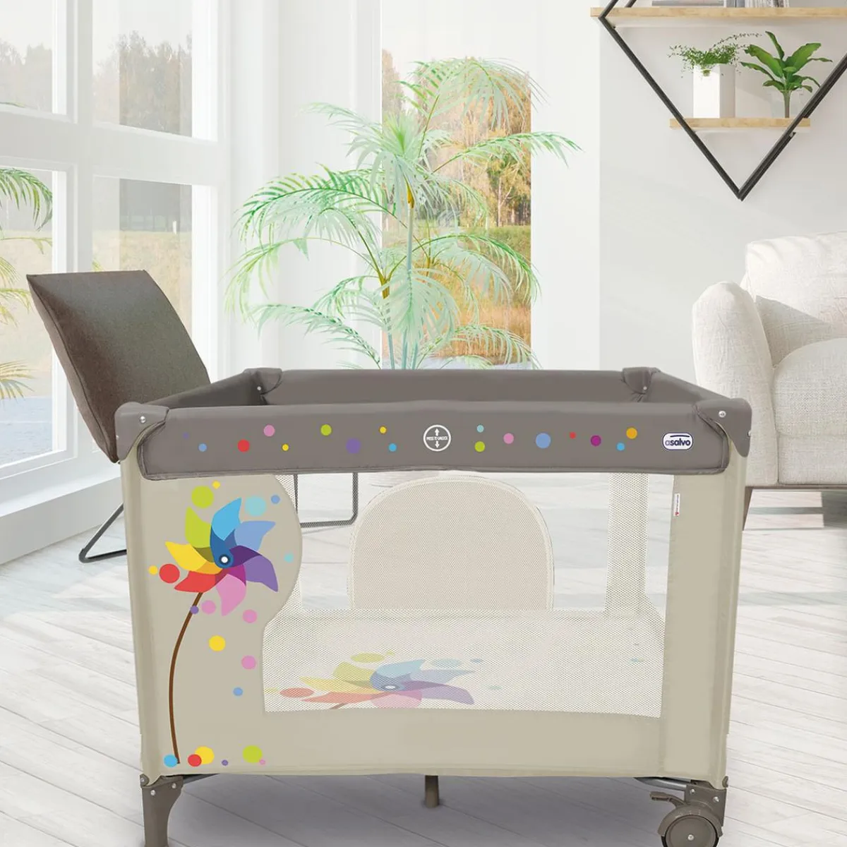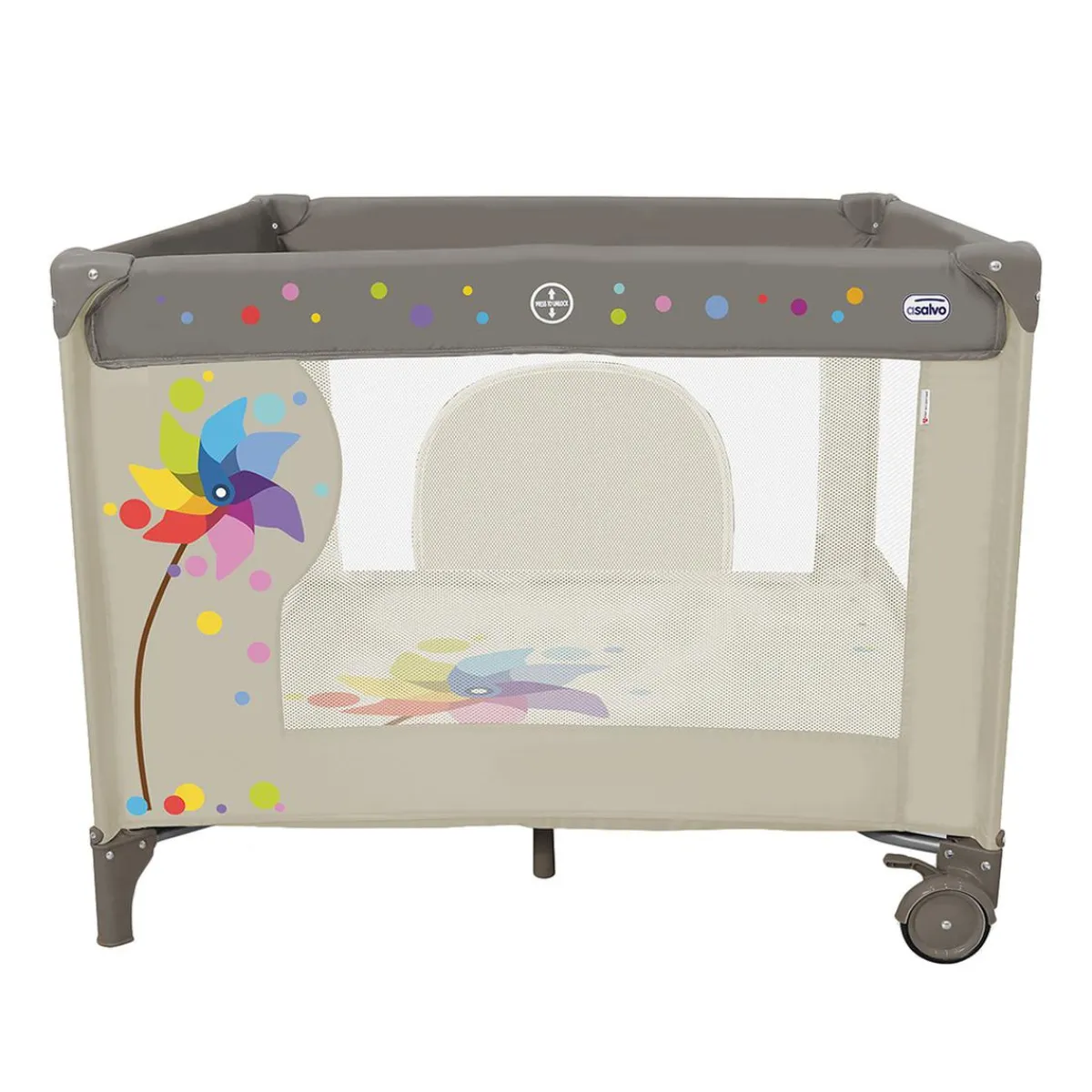 Asalvo – Parque Cuadrado Molinillo, un parque de diseño sólido, con 2 ruedas con freno y decoración en los 4 lados para que el niño lo utilice desde los primeros meses.