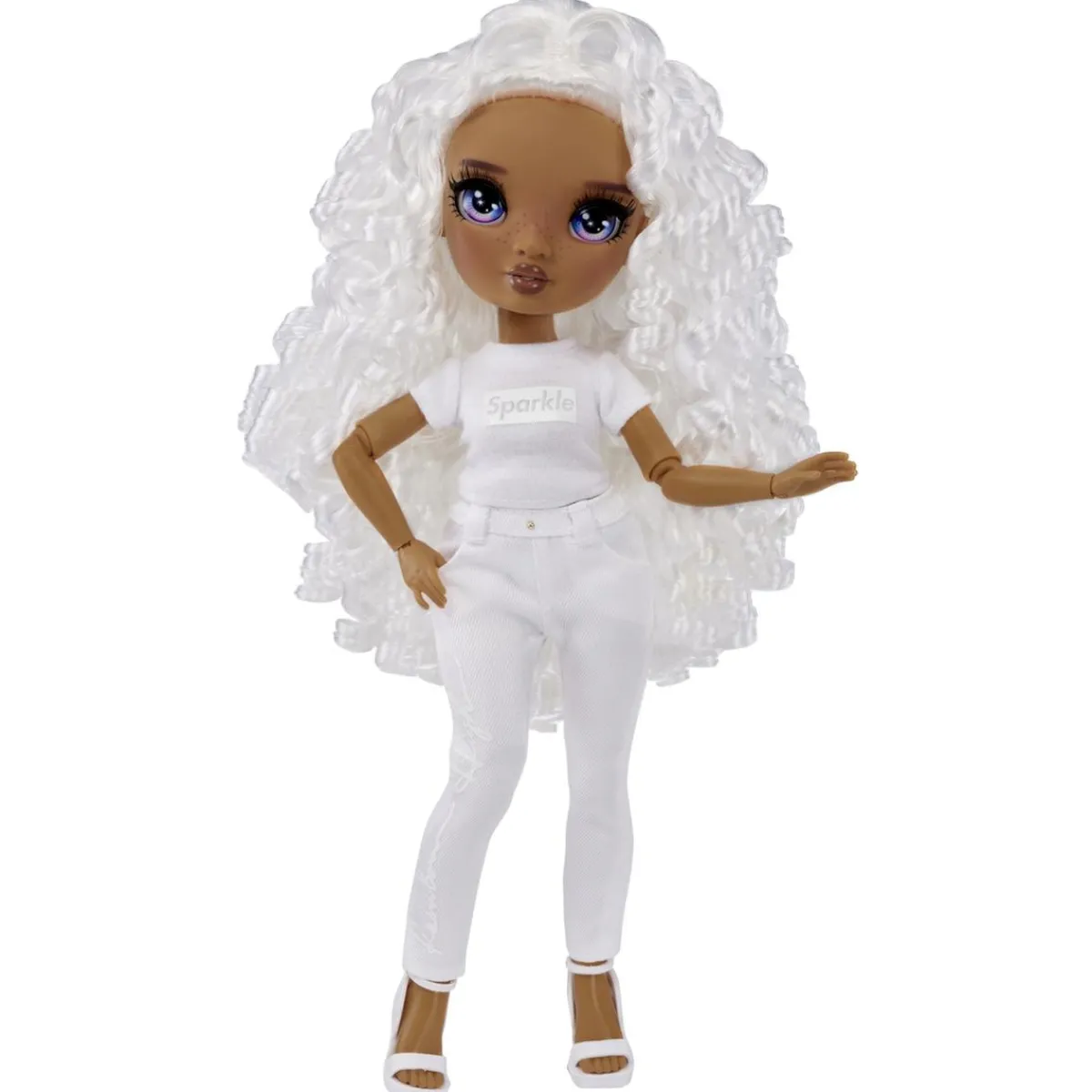 Esta versión de la muñeca Rainbow High Color & Create cuenta con ojos morados y un impactante diseño transparente. Con su pelo largo y blanco, es el lienzo perfecto para mostrar tus dotes creativas y combinar colores y diseños. Juega, crea y sorprende con la muñeca Rainbow High Color & Create.