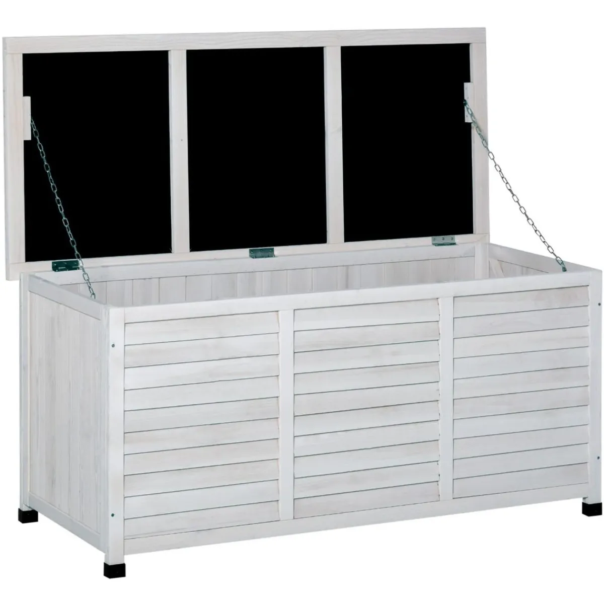 Outsunny – Baúl de jardín de madera Blanco. Este baúl de almacenamiento para exterior es una solución ideal para tener en tu jardín. Un amplio espacio para almacenar herramientas de jardinería, juguetes de exterior, etc. Hecho de madera de abeto maciza tratada para resistir a la intemperie y con protectores en las patas para evitar el contacto de la madera con el suelo. Se puede usar como baúl de almacenaje y también para sentarse. Su diseño de persiana ofrece una buena ventilación interior. ¡Funcional y bonito!