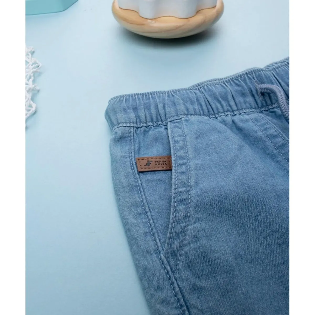 Bermuda casual de chambray para niño. La prenda se presenta en azul denim total con bolsillos de corte transversal. El ajuste es holgado y regulable gracias a un cordón en la cintura con lazo a juego. Los bermudas para niño son adecuados para ocasiones casuales y fácilmente combinables. Accesorios no a la venta. El paquete contiene solo la prenda de vestir.