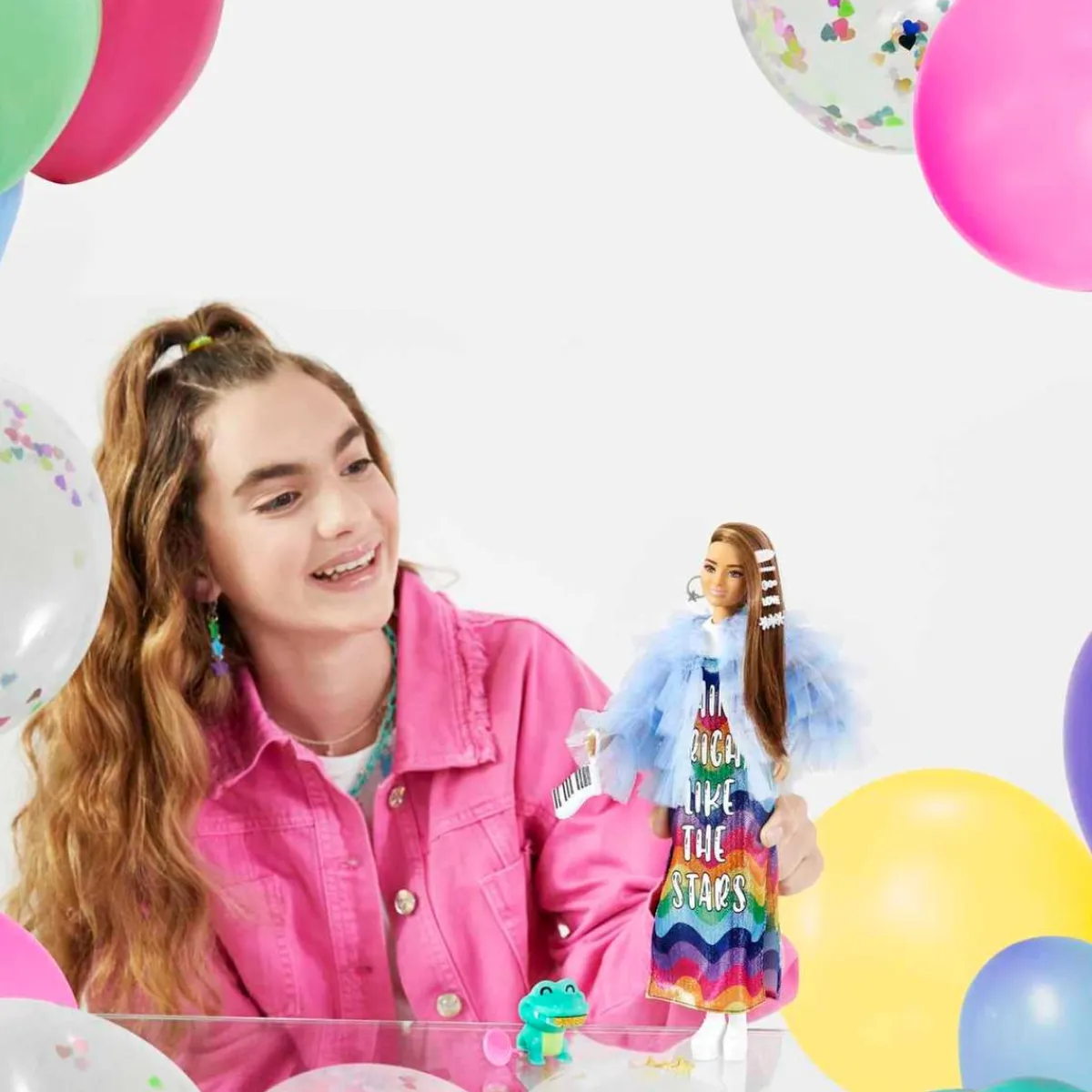 Barbie – Muñeca Extra – Vestido arcoíris, una muñeca de la colección Barbie Extra que desprende estilo de la cabeza a los pies.