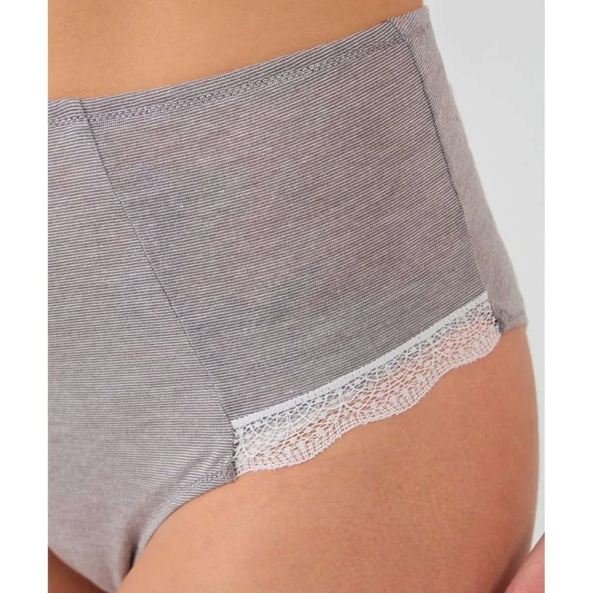 Braga de cintura alta con un diseño que crea un delicado efecto acanalado. El bordado de encaje lateral y el pequeño lazo decorativo añaden un toque romántico y refinado. Combínalo con el sujetador a juego.
