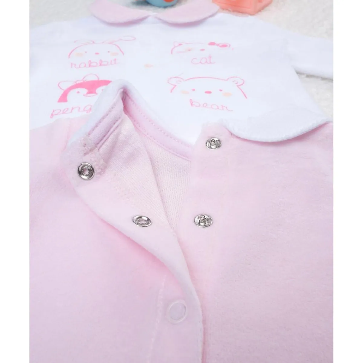 Pack compuesto por dos conjuntos de terciopelo con camiseta y polainas. Una camiseta es color crema con un osito, un gatito, un conejito y un pingüino estampados en la parte delantera, con automáticos en la parte trasera y mangas largas; polainas rosadas a juego. La otra camiseta es rosa con un gatito y un conejito en el frente; polainas color crema a juego con estampado de pequeños dibujos rosas por toda la parte. Accesorios no a la venta. El paquete contiene solo la prenda de vestir.