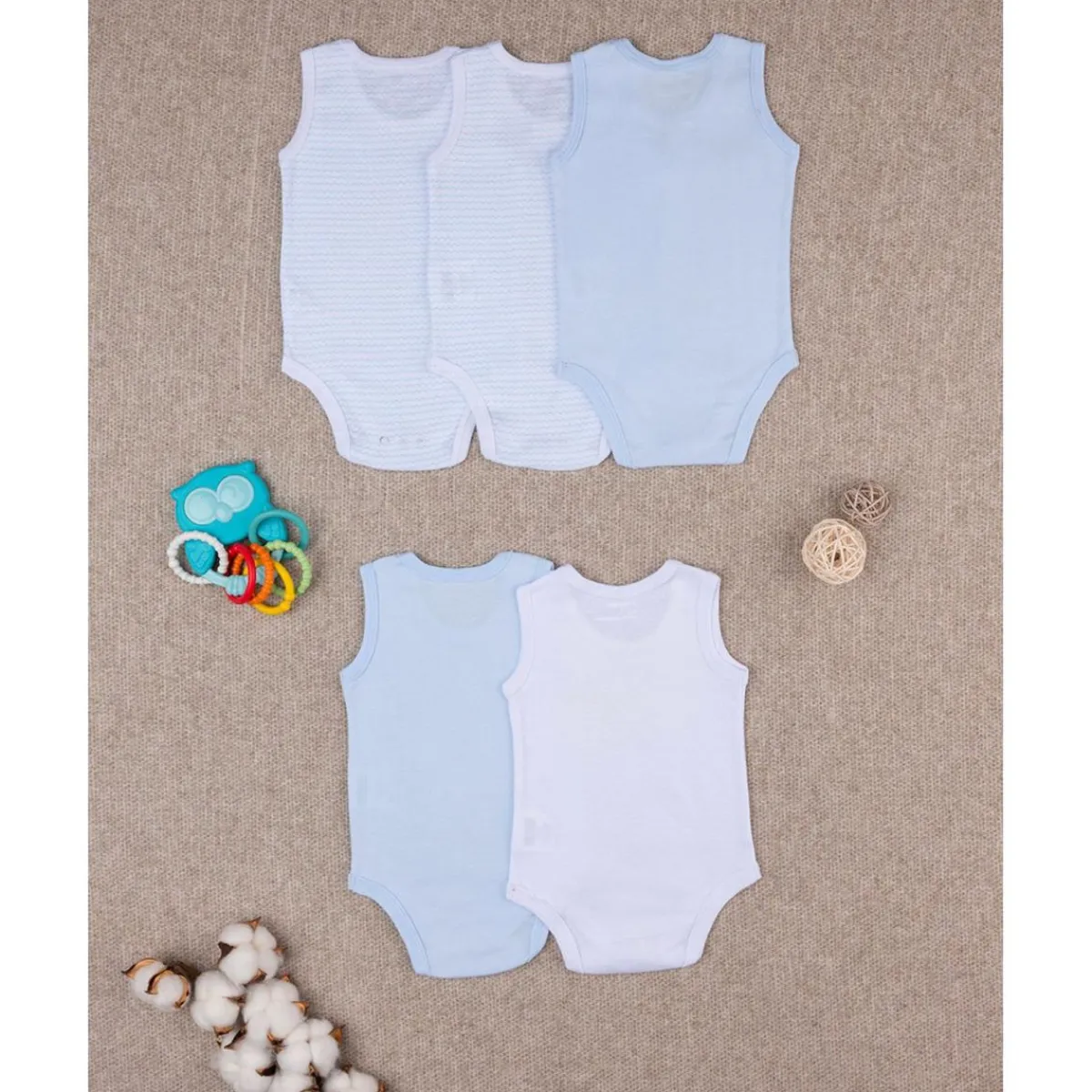 Práctico paquete compuesto por cinco bodies con manga sisa, realizados en fresco algodón y equipados con un cómodo cierre de botones automáticos en la entrepierna. Las prendas tienen estampados variados en tonos blanco y azul. El ajuste es holgado y práctico gracias a los botones automáticos en la entrepierna. Accesorios no a la venta. El paquete contiene solo la prenda de vestir.
