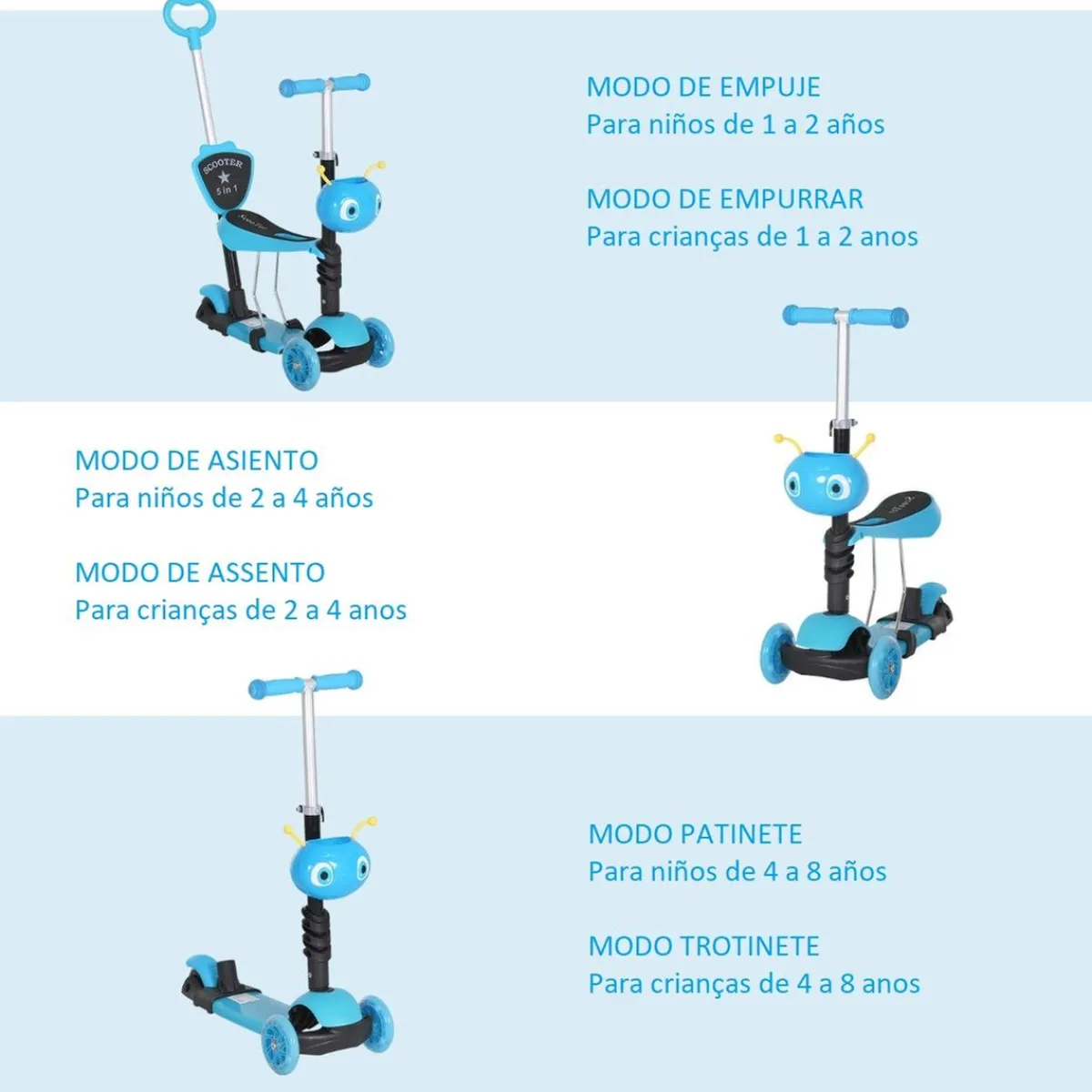 - El asiento y el mango de empuje para los adultos son extraíbles, proporcionando diferentes formas de usar el patinete.