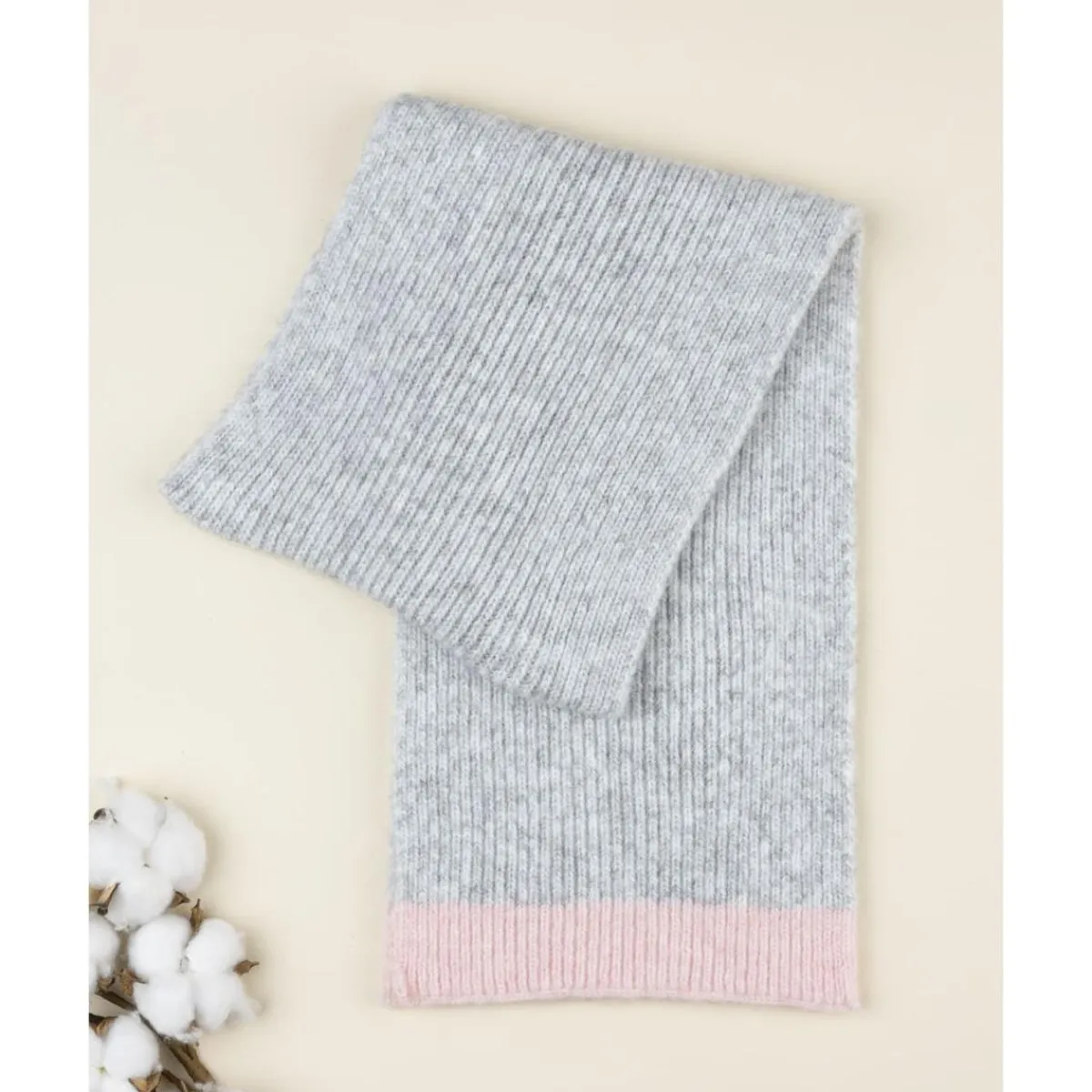 Bufanda tricot casual para niña en gris claro con bordado de Minnie en rosa coordinado. Su suavidad y manejabilidad la hacen cómoda para usar en cualquier ocasión casual, combinando fácilmente con otros accesorios de invierno.