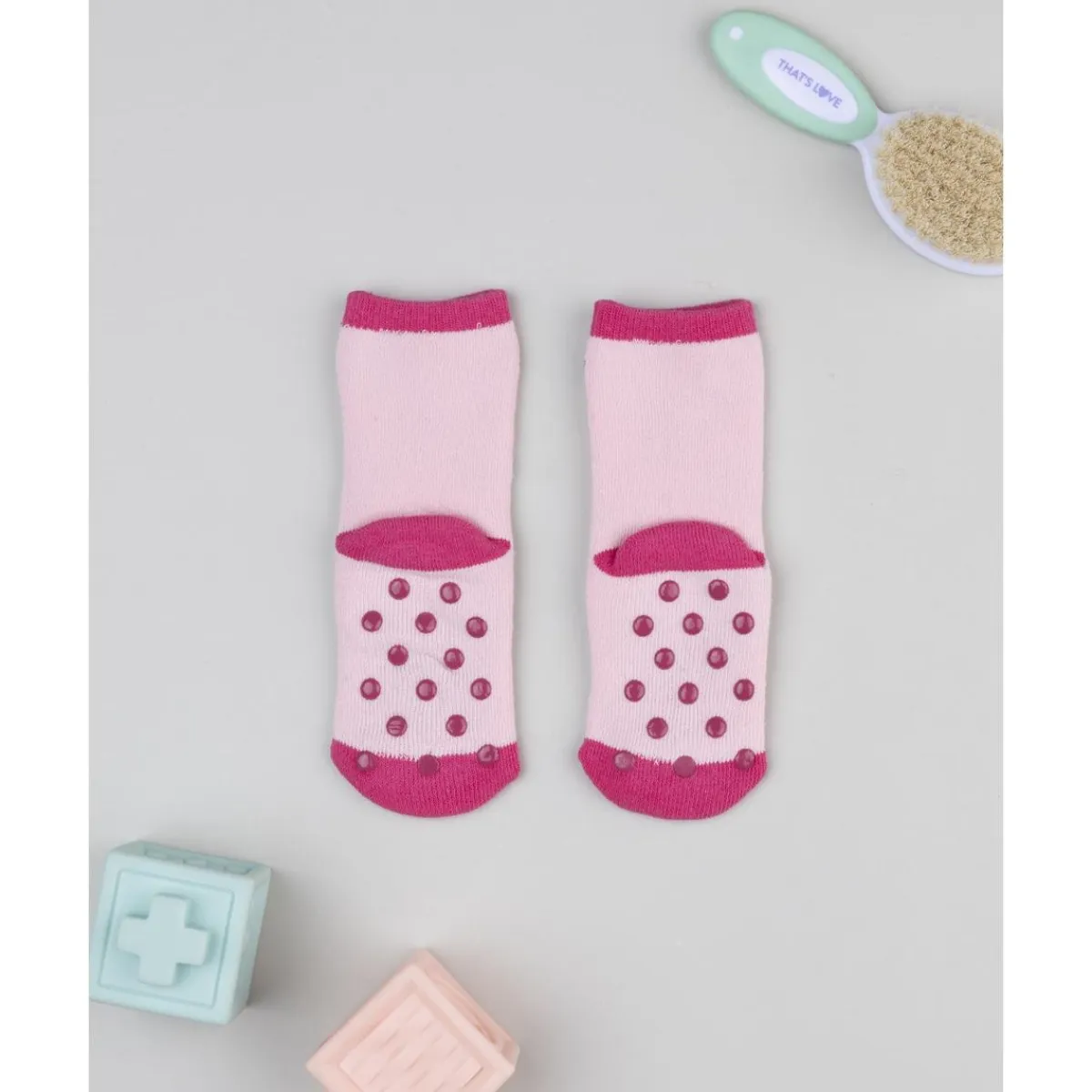 Estos calcetines antideslizantes son perfectos para mantener los pies de la niña cómodos y seguros. Confeccionados en tonos de rosa, incluyen un divertido diseño de ositos y corazones que aporta dulzura al estilo infantil.