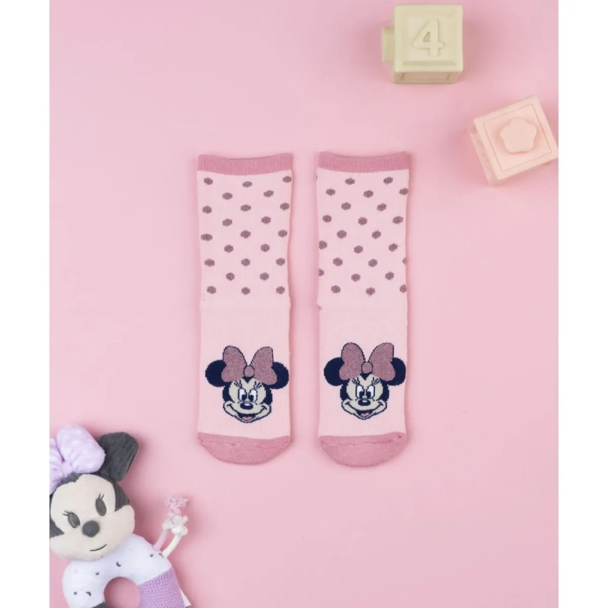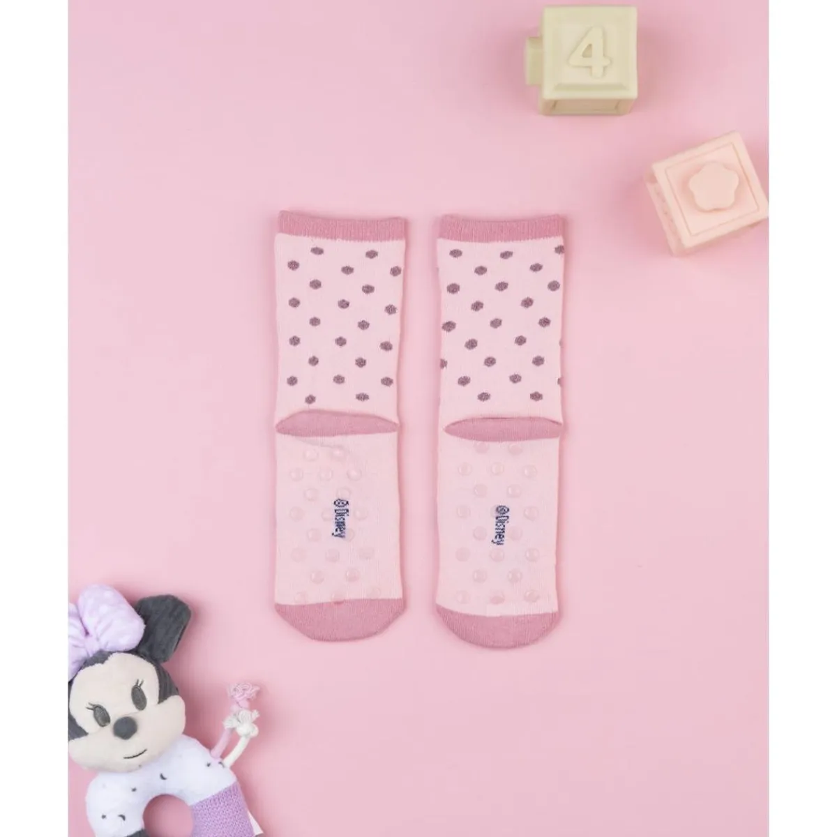 Los calcetines antideslizantes de niña en color rosa están decorados con Minnie y detalles bordados. Incluyen refuerzos en puntera, talón y tobillo en tono más oscuro, que aportan contraste al diseño.