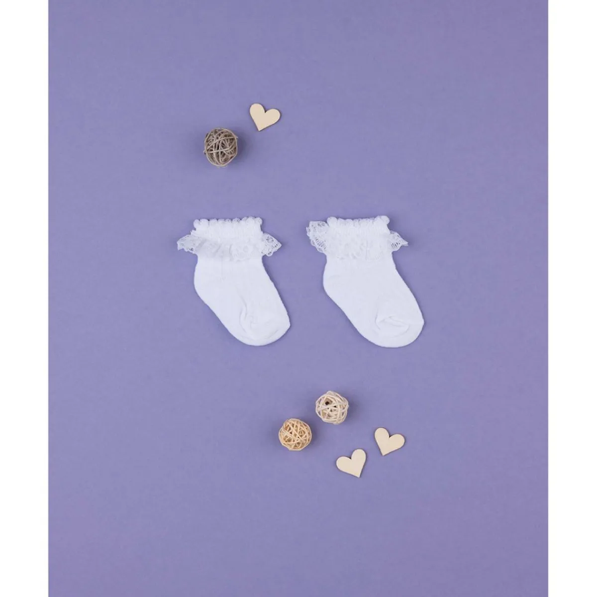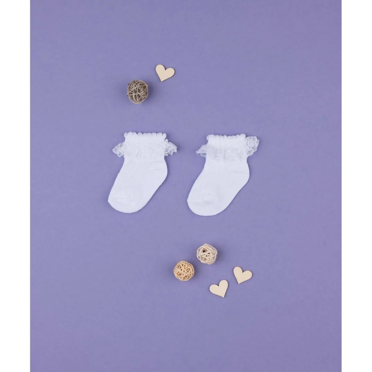 Calcetines para bebé de algodón decorado. Los calcetines se presentan en color blanco liso y están adornados con un refinado encaje blanco en el tobillo. Cómodos y prácticos, estos calcetines son perfectos para conjuntos elegantes y femeninos de bebé. Accesorios no a la venta. El paquete contiene solo la prenda de vestir.
