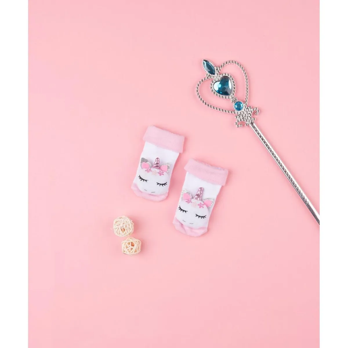 Encantadores calcetines con sonajero para niña. Diseño en blanco y rosa claro con un bonito unicornio en relieve con detalles en purpurina plateada.
