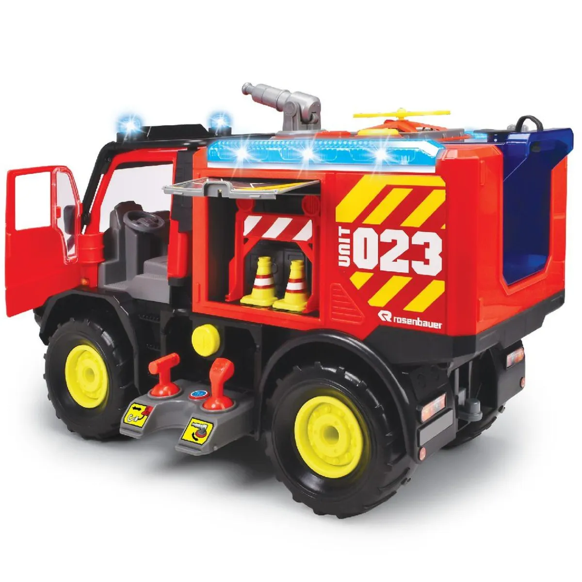 - Vehículo oficial Mercedes UNIMOG-Rosenbauer con luces, sonidos y ruedas con suspensión