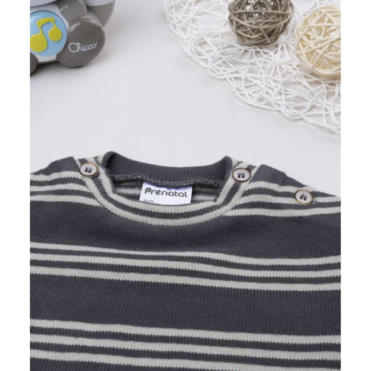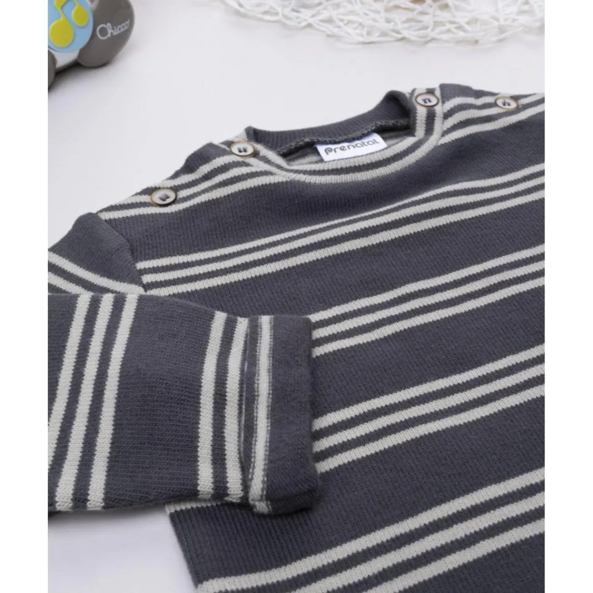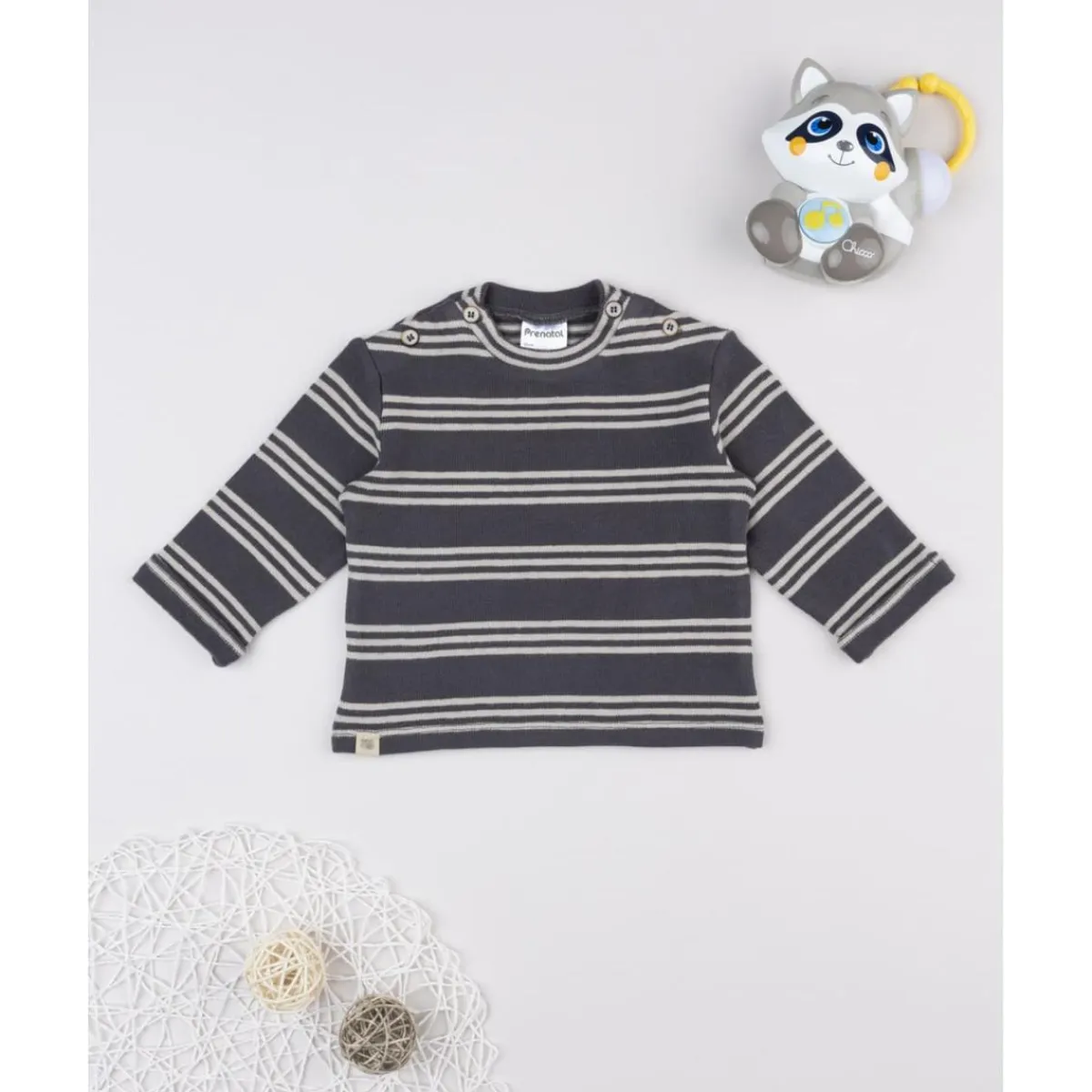 Práctica camiseta de manga larga para niño en tejido de punto fino gris con rayas azuladas. Suave y elástica, garantiza libertad de movimiento y confort diario.