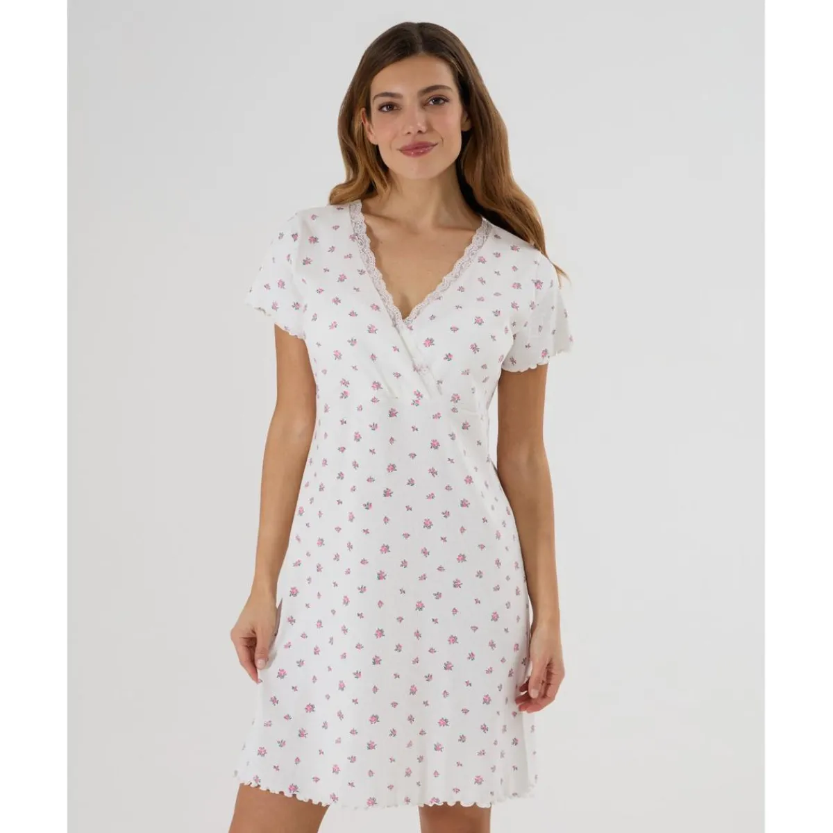 Encantador camisón de noche para embarazadas y lactancia con un romántico diseño floral. Confeccionado en blanco puro con textura de canalé, este camisón combina elegancia y funcionalidad para la futura mamá.
