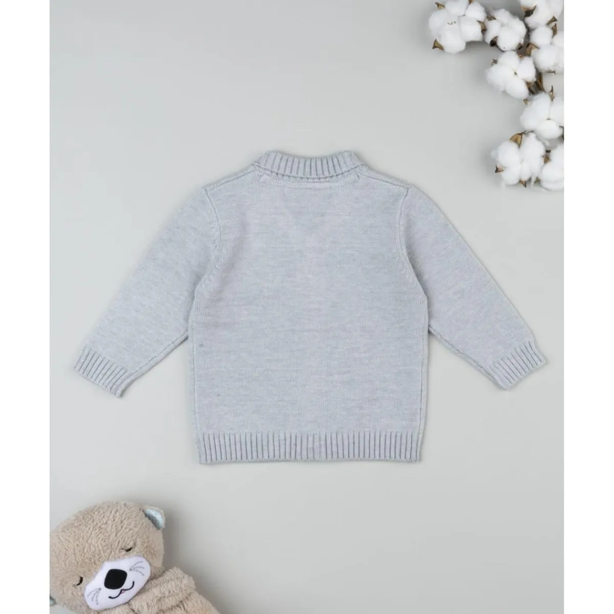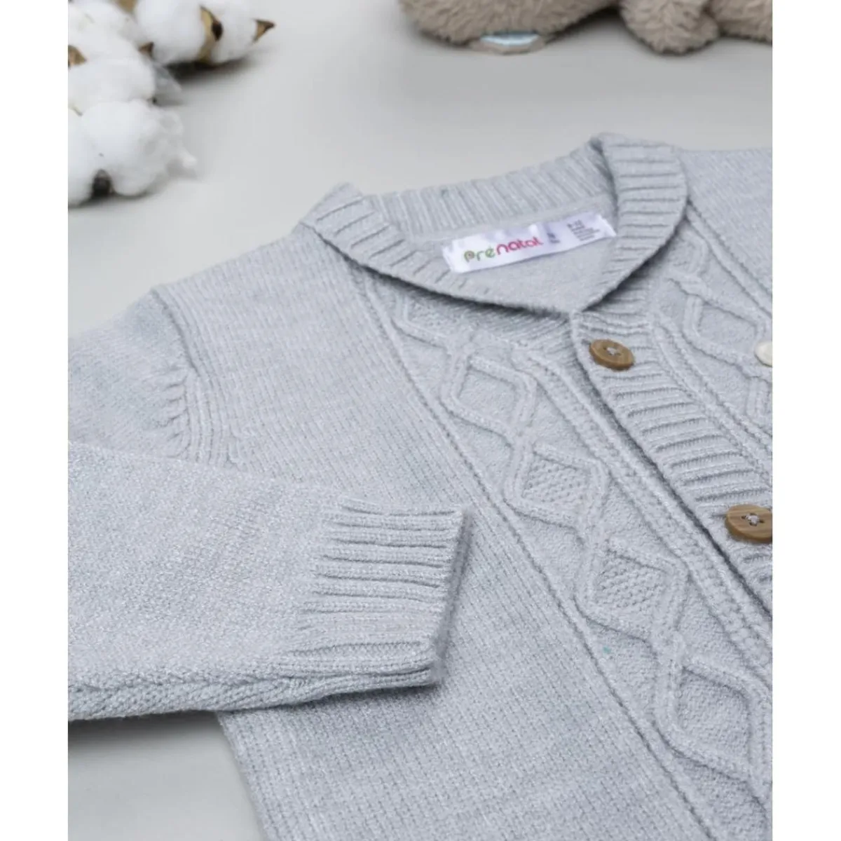 Suave cárdigan tricot para bebé niño en color gris claro con textura entrelazada y parche de osito sobre el pecho. Una prenda cálida y versátil ideal para combinar con cualquier look.
