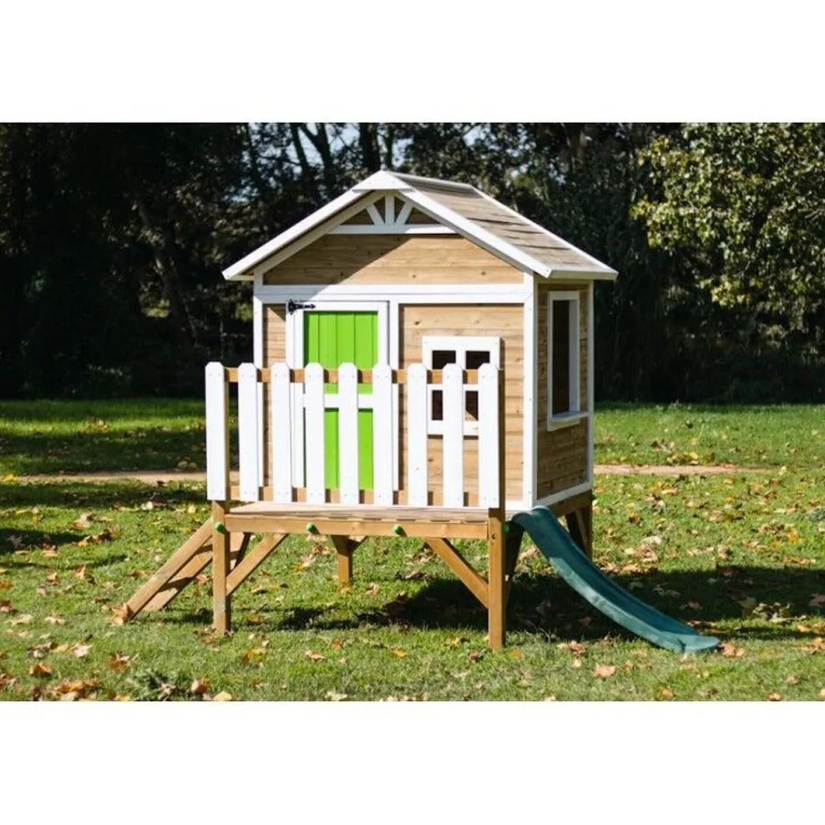 Convierte tu jardín en un espacio mágico con la casita elevada MASGAMES FLAM. Diseñada para que los más pequeños den rienda suelta a su imaginación, esta encantadora casita de madera se alza sobre una estructura de 60 cm que la aísla del suelo y añade un extra de emoción gracias a su divertido tobogán incluido.