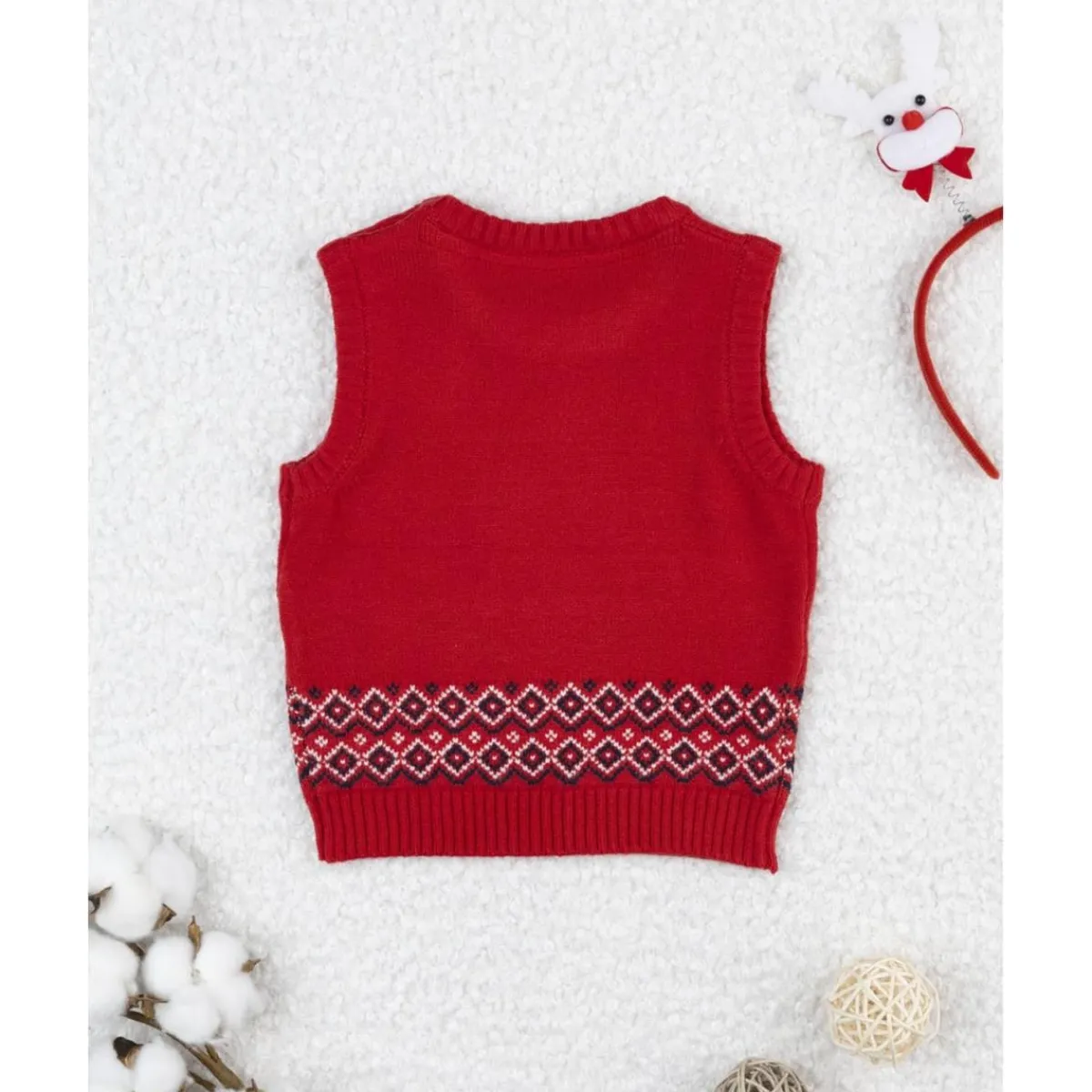 Encantador chaleco tricot para bebé en color rojo con pequeños bordados blancos. Su textura cálida y su diseño clásico lo hacen perfecto para combinar sobre camisas o camisetas en los días frescos.