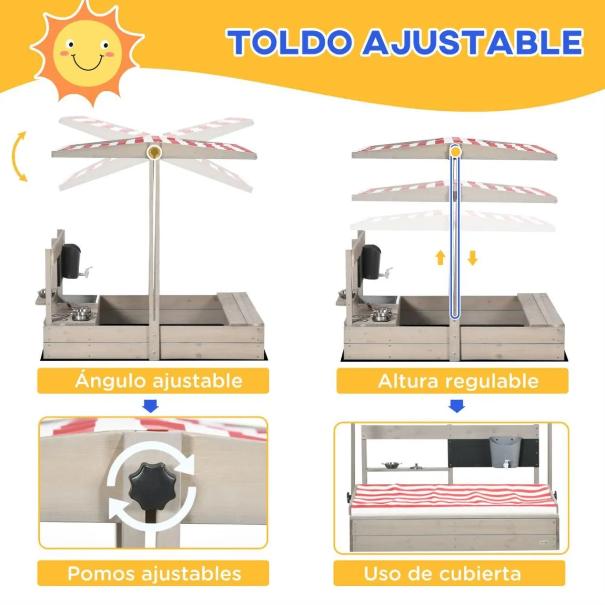 El arenero está hecho de madera de abeto y también tiene un toldo ajustable, para proteger a los niños del sol mientras se divierten.