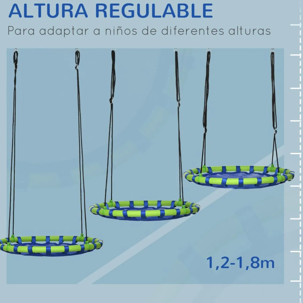 Este columpio de Outsunny está hecho con un marco resistente de metal y revestido con tela Oxford proporciona un apoyo fuerte lo suficientemente resistente para colgar en una rama de árbol o un soporte de columpio y soportar hasta 150 kg. Las cuerdas se pueden regular en altura para ajustar según tus necesidades.