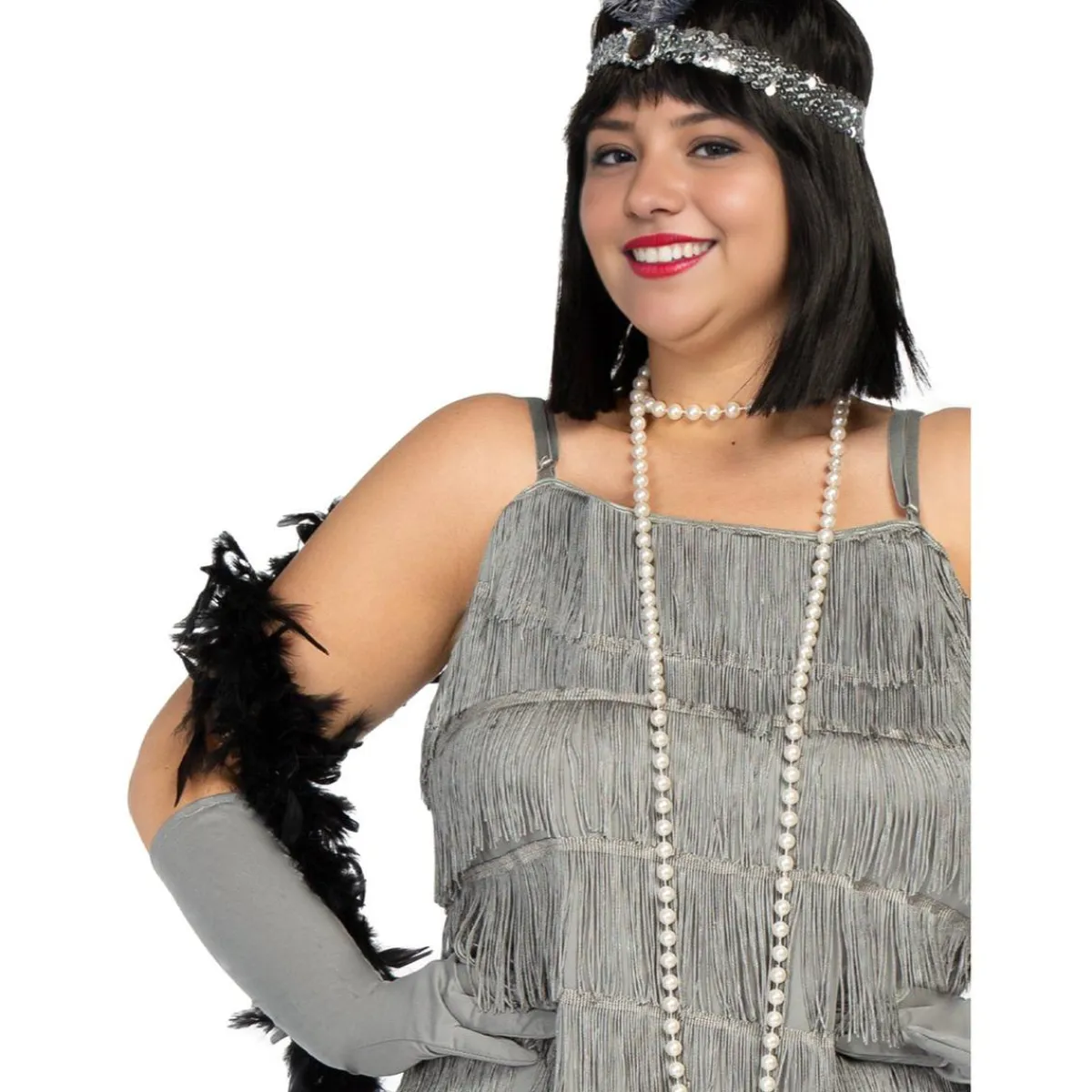 El conjunto incluye un vestido con flecos que se mueven al ritmo de la música, unos guantes largos que añaden un toque de glamour y una cinta decorativa para la cabeza que completa el estilo de la época.