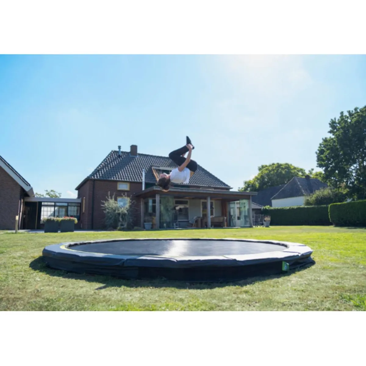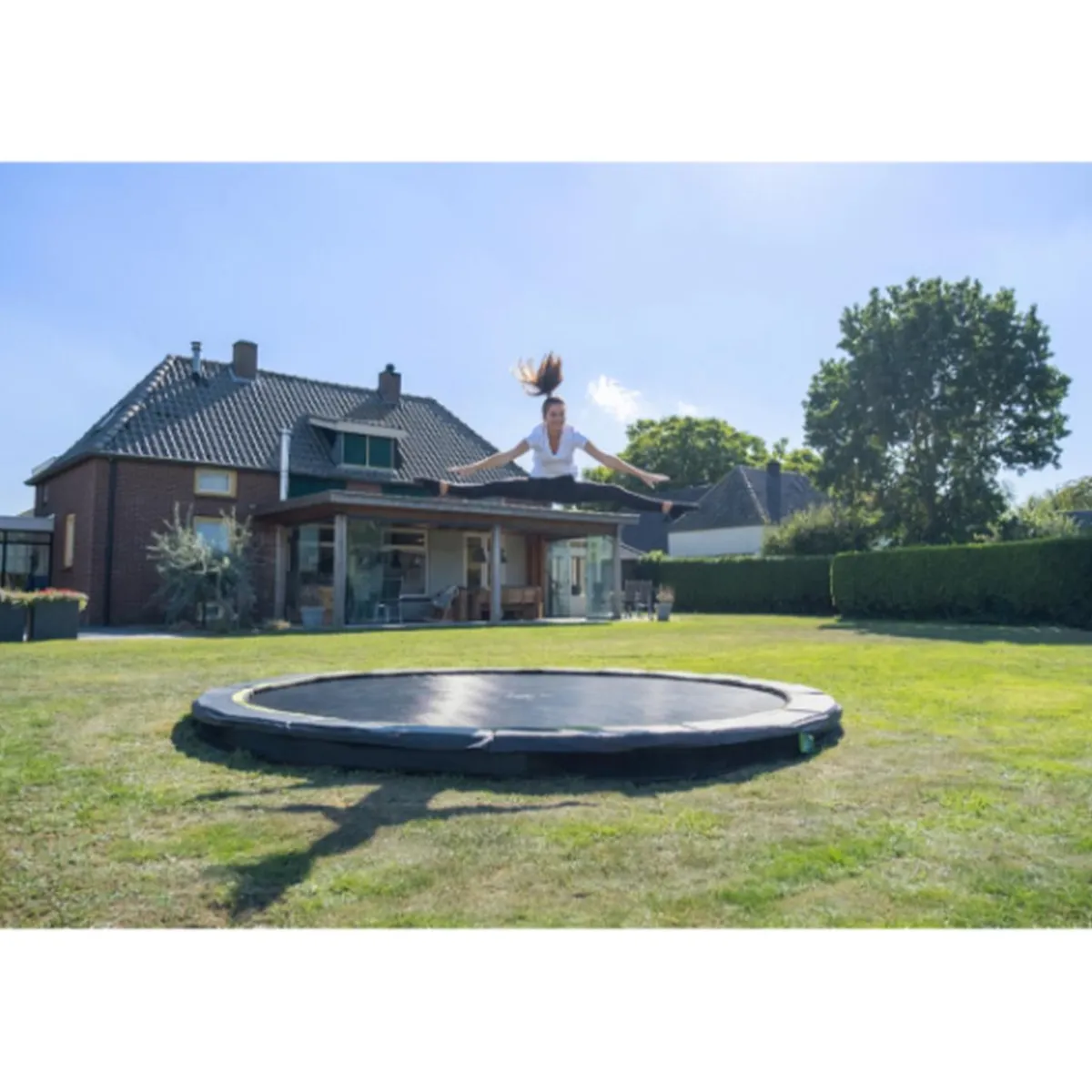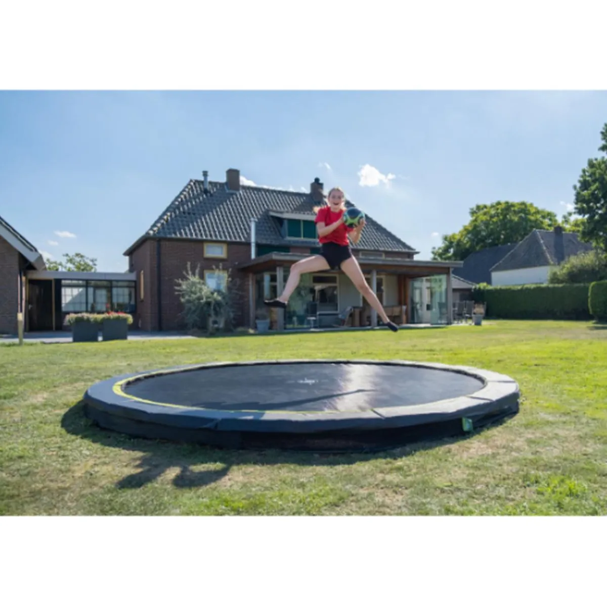 El trampolín deportivo de tierra Silhouette se entrega sin red de seguridad, lo que lo hace fácilmente accesible. El borde protector de alta calidad cubre completamente los resortes galvanizados y está equipado con un sistema de protección de pies especialmente desarrollado para que su pie no pueda terminar entre los resortes. Los muelles resistentes garantizan una buena resistencia al rebote. El marco del trampolín deportivo Silhouette está galvanizado y recubierto de polvo para que el óxido no tenga ninguna posibilidad.