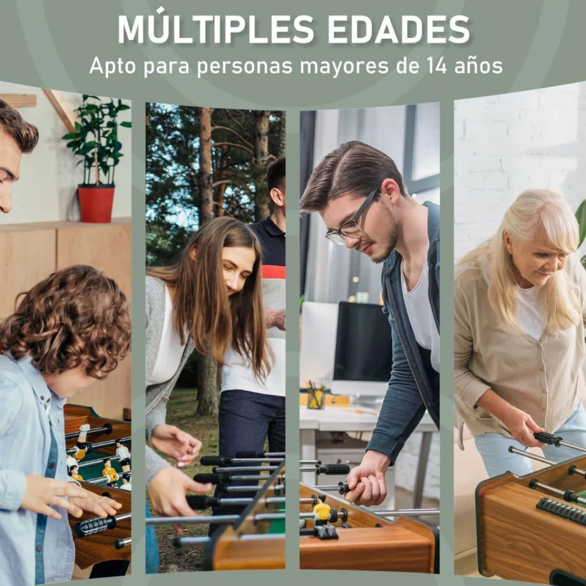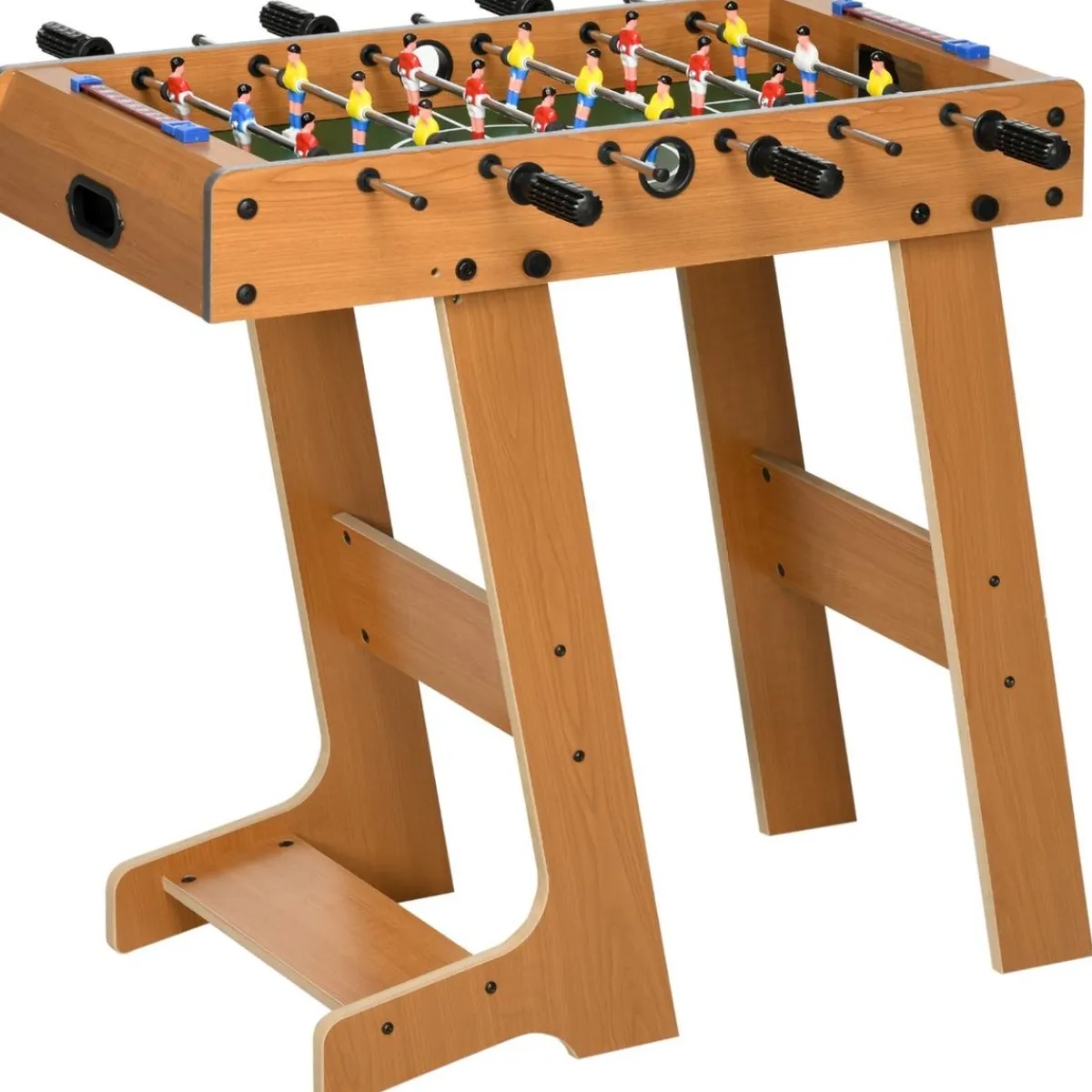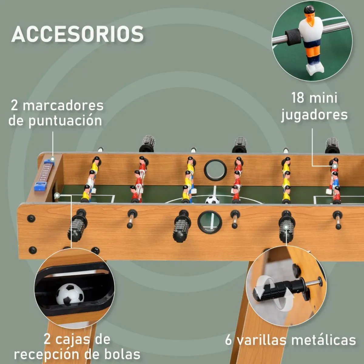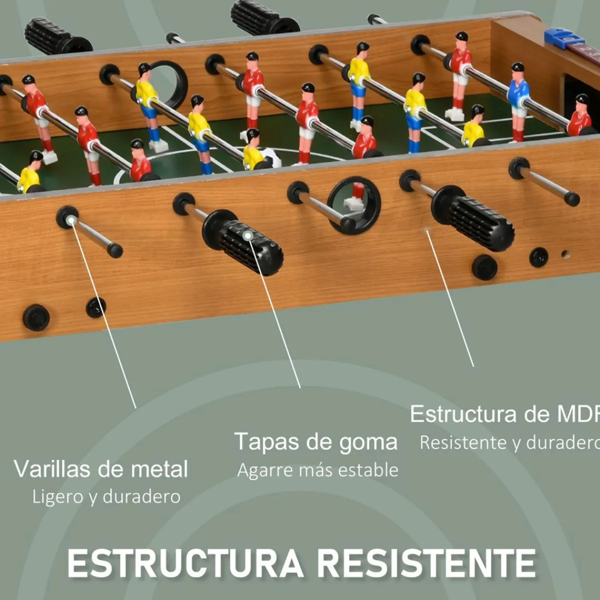 - Futbolín con estructura de madera de tamaño compacto.