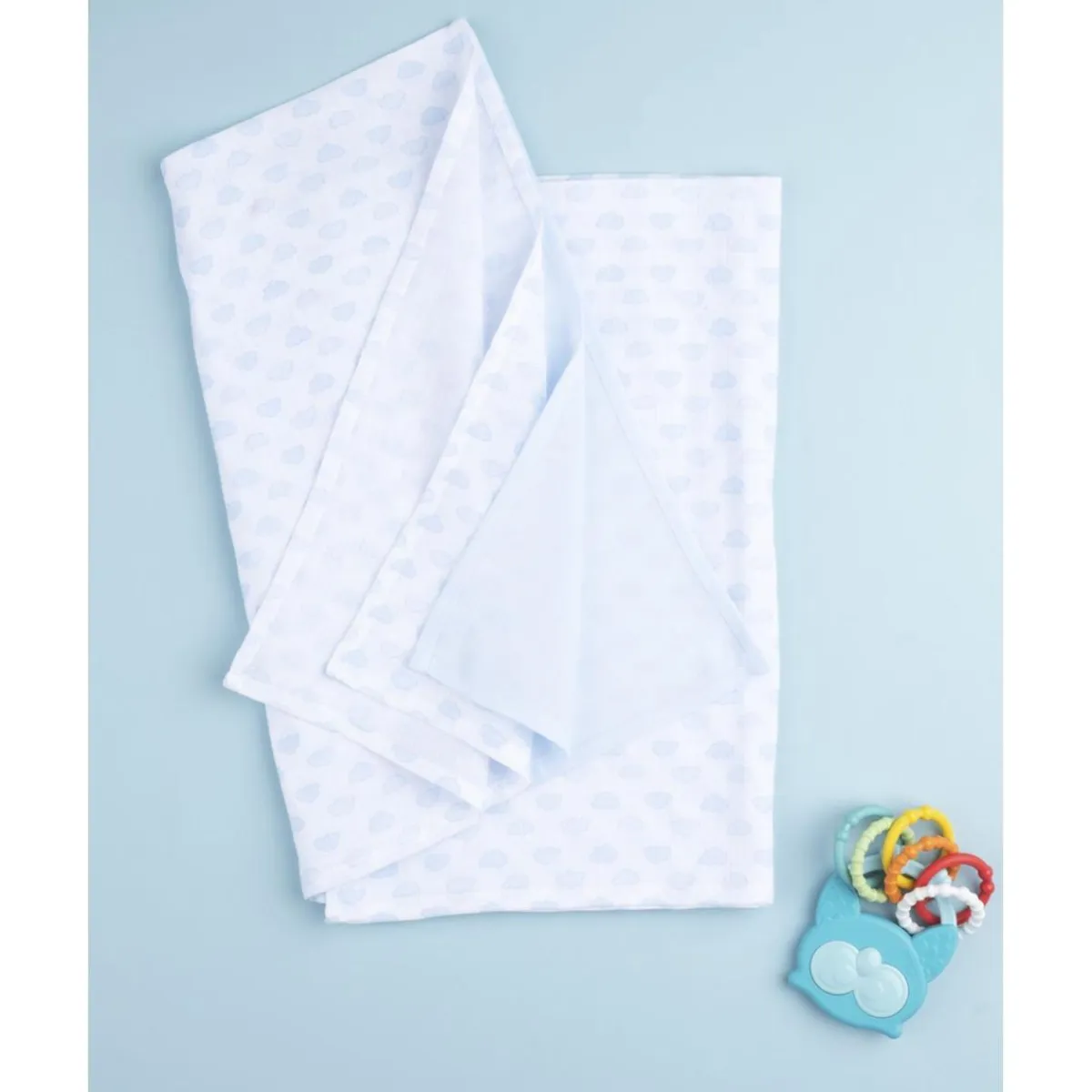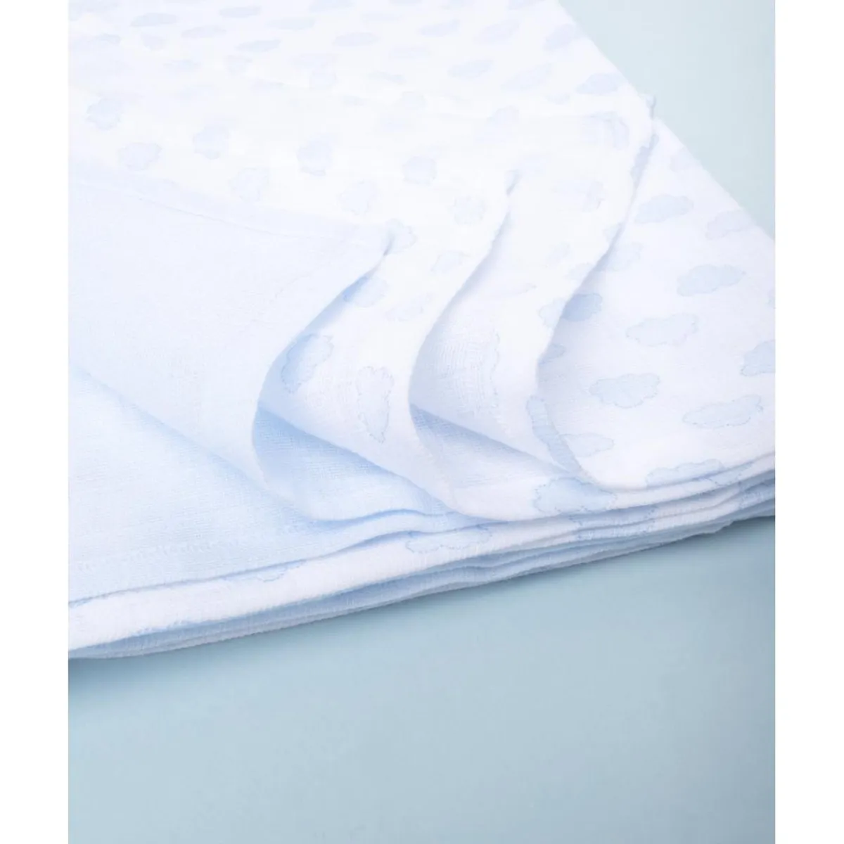 Las muselinas presentan un delicado estampado de nubes estilizadas sobre fondo blanco, en tono azul claro.