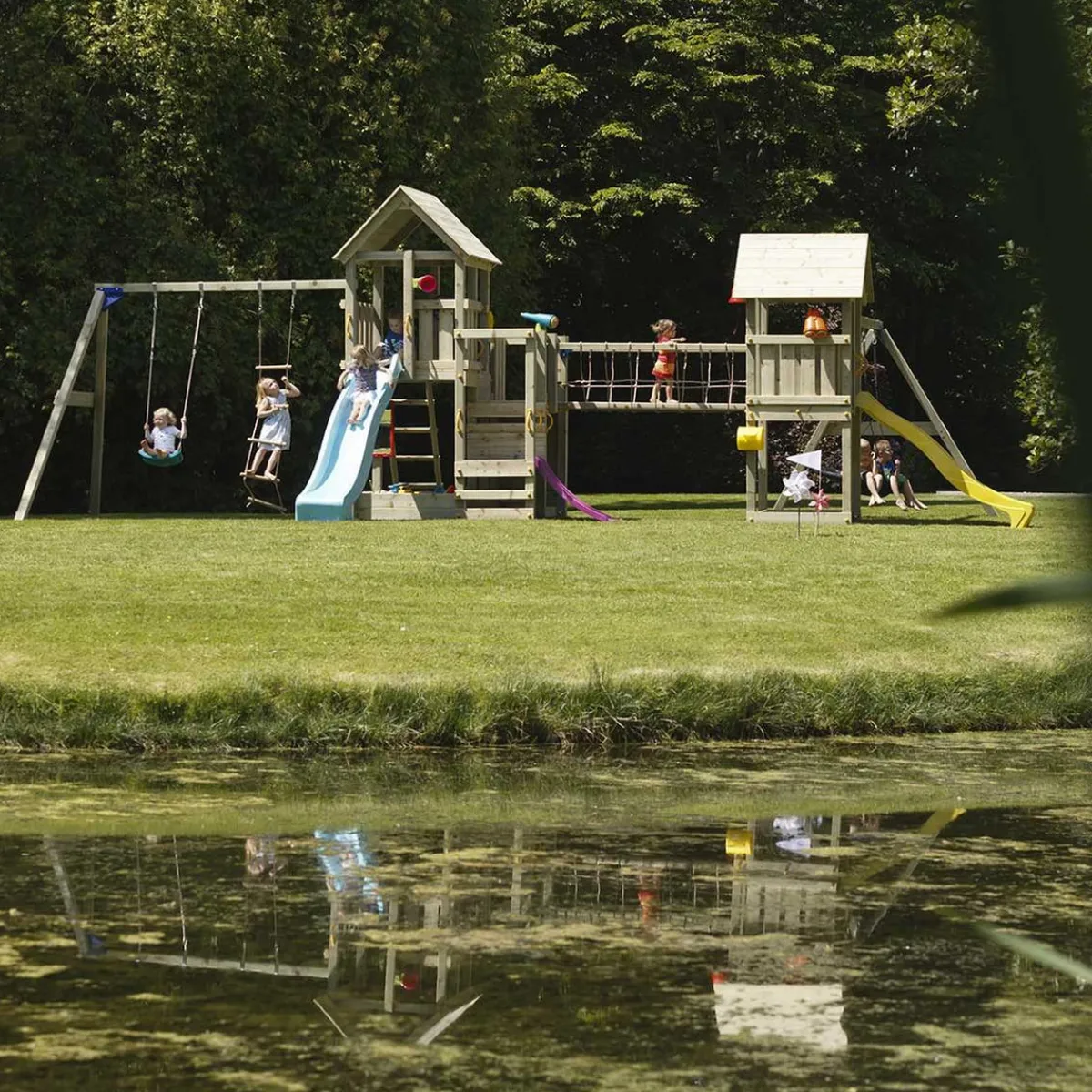 Debe dejar 2 metros alrededor de zona de seguridad. Los postes de madera cuadrada son de 80mm. El conjunto parque infantil Himalaya incluye las maderas, las 2 rampas de tobogán verde, los anclajes para fijar el parque en un suelo blando de tierra o césped, los tapones de perno, las manijas y las instrucciones de montaje. Todo el conjunto también incluye un @SWING 1,5 mts. con 2 asientos de plástico con cuerdas + un @SWING 1,2 mts. Con 2 asientos de plástico con cuerdas + @BRIDGE.