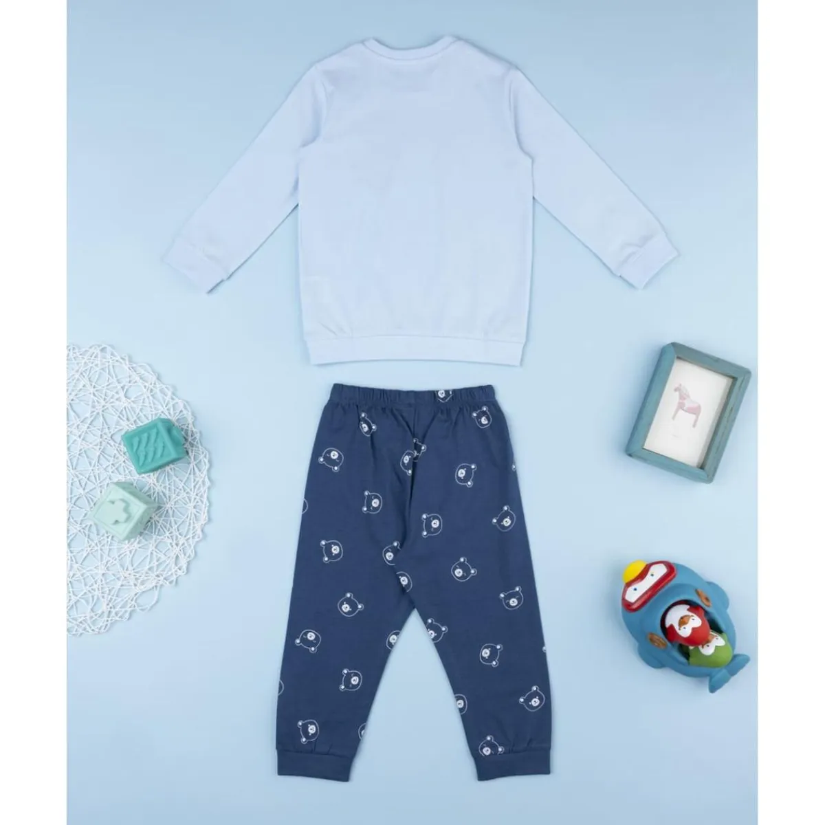 Este pijama de dos piezas para niño es perfecto para las noches más frías. Con una camiseta de manga larga en color azul noche con un estampado de ositos y pantalones a juego, este conjunto ofrece comodidad y estilo. Los pantalones tienen una cintura elástica para garantizar un ajuste adecuado.