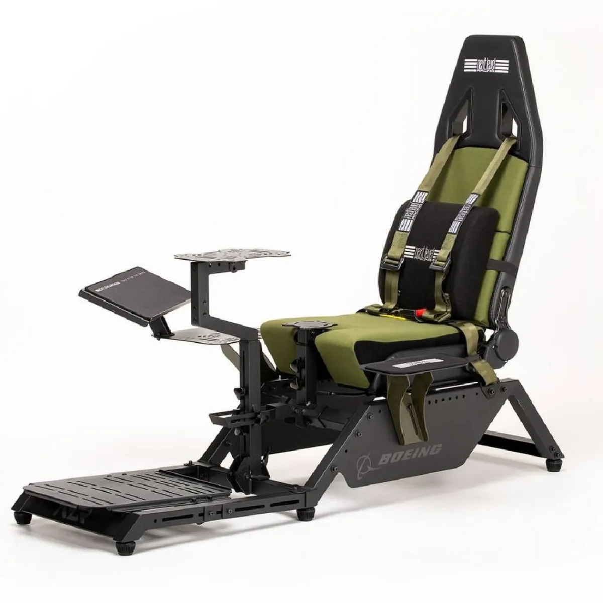 El simulador de vuelo Boeing militar permite a la comunidad Boeing interactuar con un modelo que les encanta y comprometerse con la creciente comunidad de simuladores de vuelo. El asiento está cubierto con una tela de lona verde de inspiración militar, para parecerse a una cabina de vuelo militar de Boeing y brindar una experiencia de vuelo cómoda durante el combate.