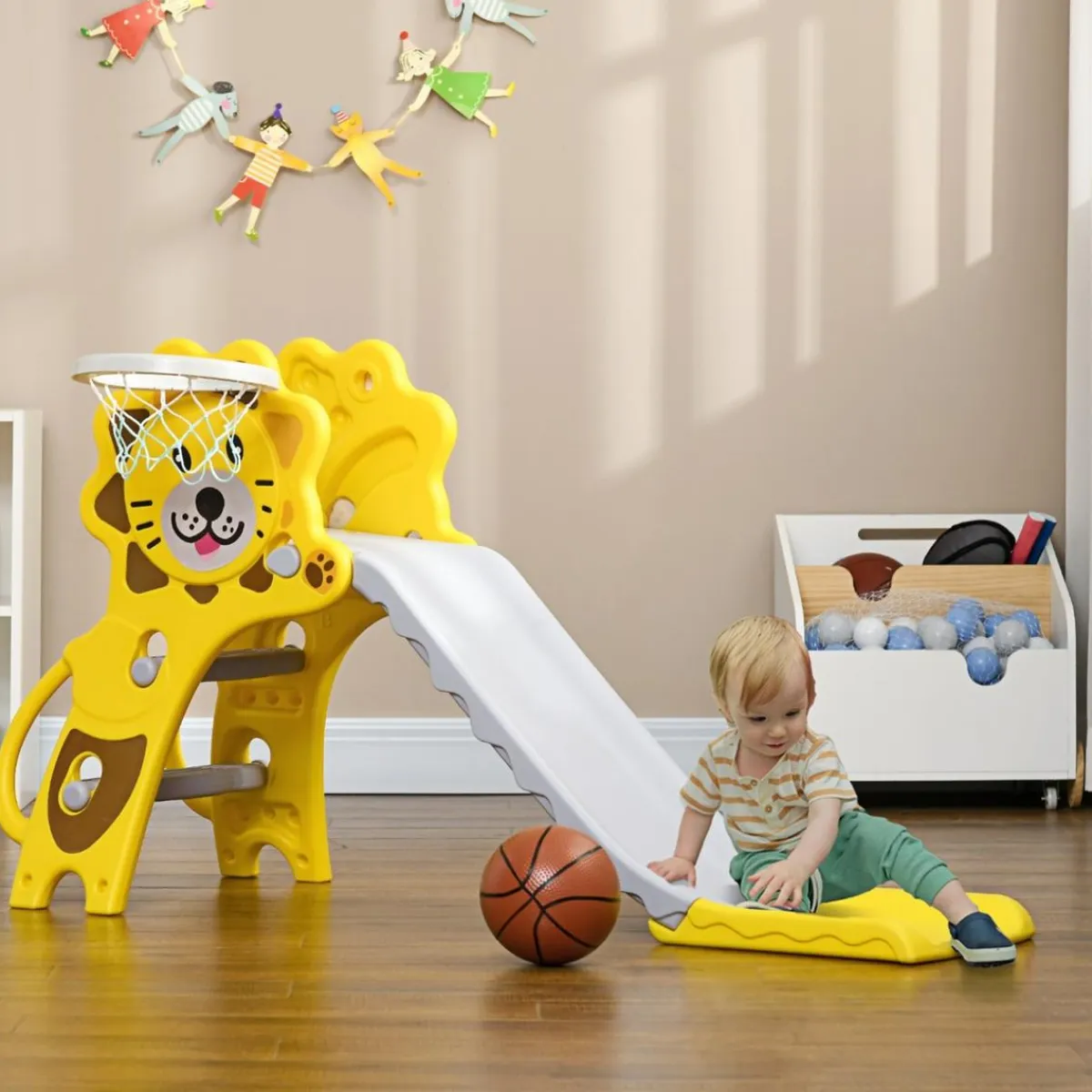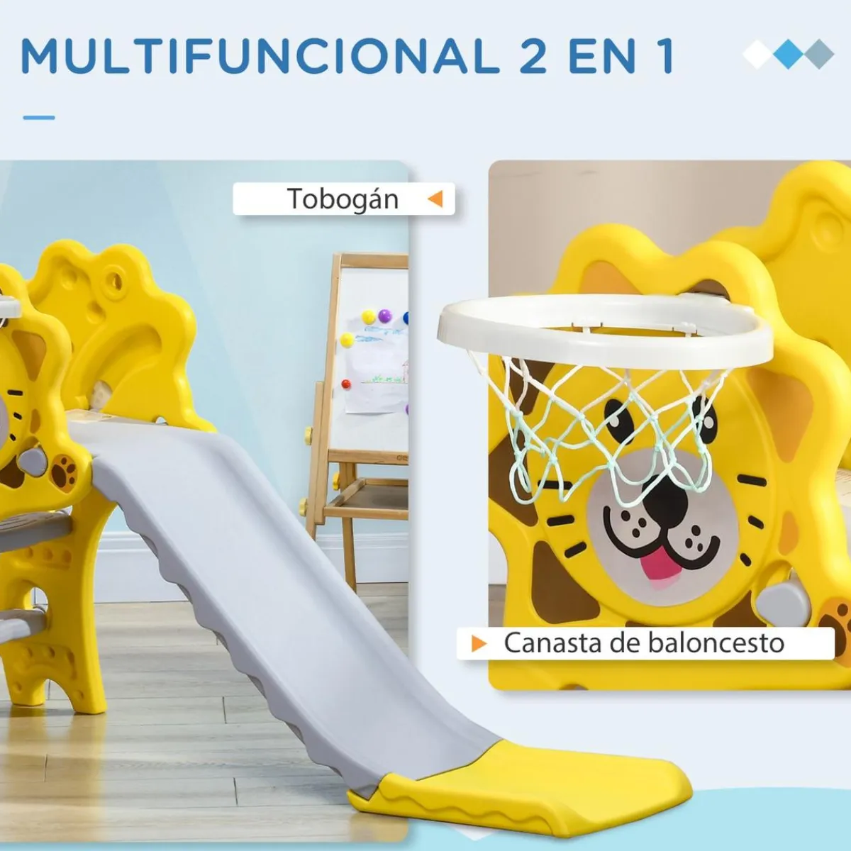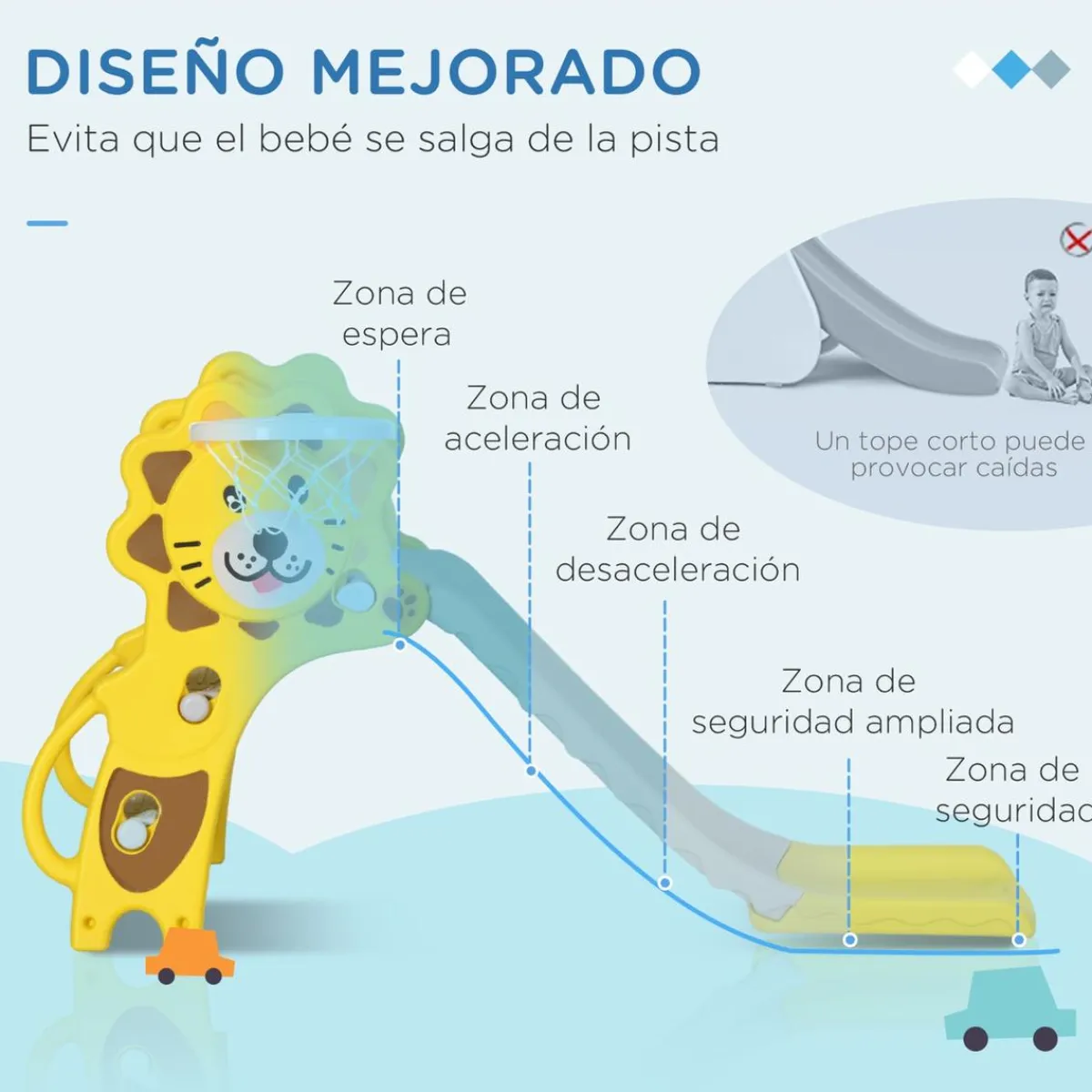 Homcom – Tobogán de interior León. Diseñado para proporcionar horas de diversión, este tobogán para niños cuenta con 2 escaleras antideslizantes para garantizar a los más pequeños un apoyo seguro y una estructura confiable. El tobogán también cuenta con una canasta de baloncesto montada lateralmente para que los niños se diviertan de varias maneras con la misma estructura. Gracias a los adorables dibujos del león, este tobogán infantil de interior añadirá un toque juguetón a los espacios de juego de los más pequeños.