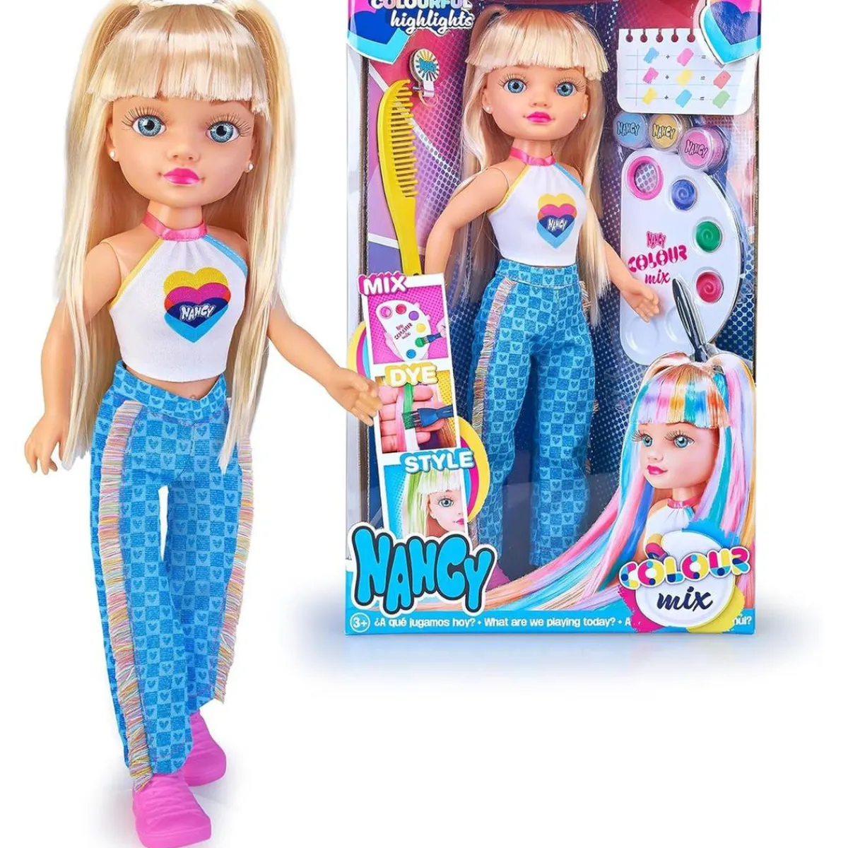 ¡Libera tu imaginación y creatividad con Nancy – Colour Mix! Esta muñeca viene con un kit de acuarelas que te permite crear una amplia gama de colores. Con la práctica paleta, podrás mezclar los colores para dar vida a nuevas tonalidades. Luego, usa el pincel incluido para añadir mechas de colores y transformar el cabello de Nancy con un estilo único y personalizado. No solo eso, con los coleteros y el peine que también vienen en el set, puedes experimentar con diferentes peinados llenos de creatividad. ¡La diversión no tiene límites!