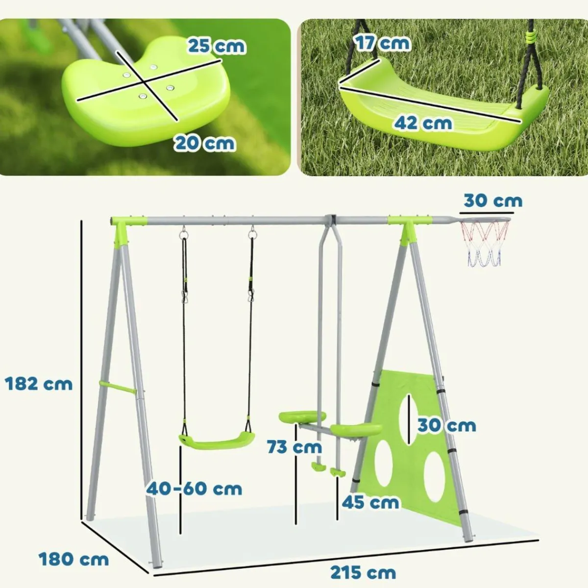 Transforma tu jardín en un auténtico parque de diversiones con el conjunto de columpios Aiyaplay. Su diseño 4 en 1 incluye un asiento de columpio ajustable, un planeador para dos niños y accesorios deportivos, como un aro de baloncesto y una portería de fútbol, ideal para que 3 a 4 niños jueguen juntos. Fabricado en metal con recubrimiento en polvo y PE, es perfecto para disfrutar al aire libre en cualquier clima.