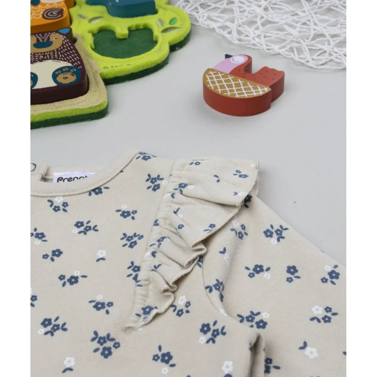 Dulce conjunto de dos piezas para niña compuesto por sudadera beige con estampado floral y pantalón azul marino. Las mangas presentan volantes en los hombros y cierre trasero con botones automáticos.