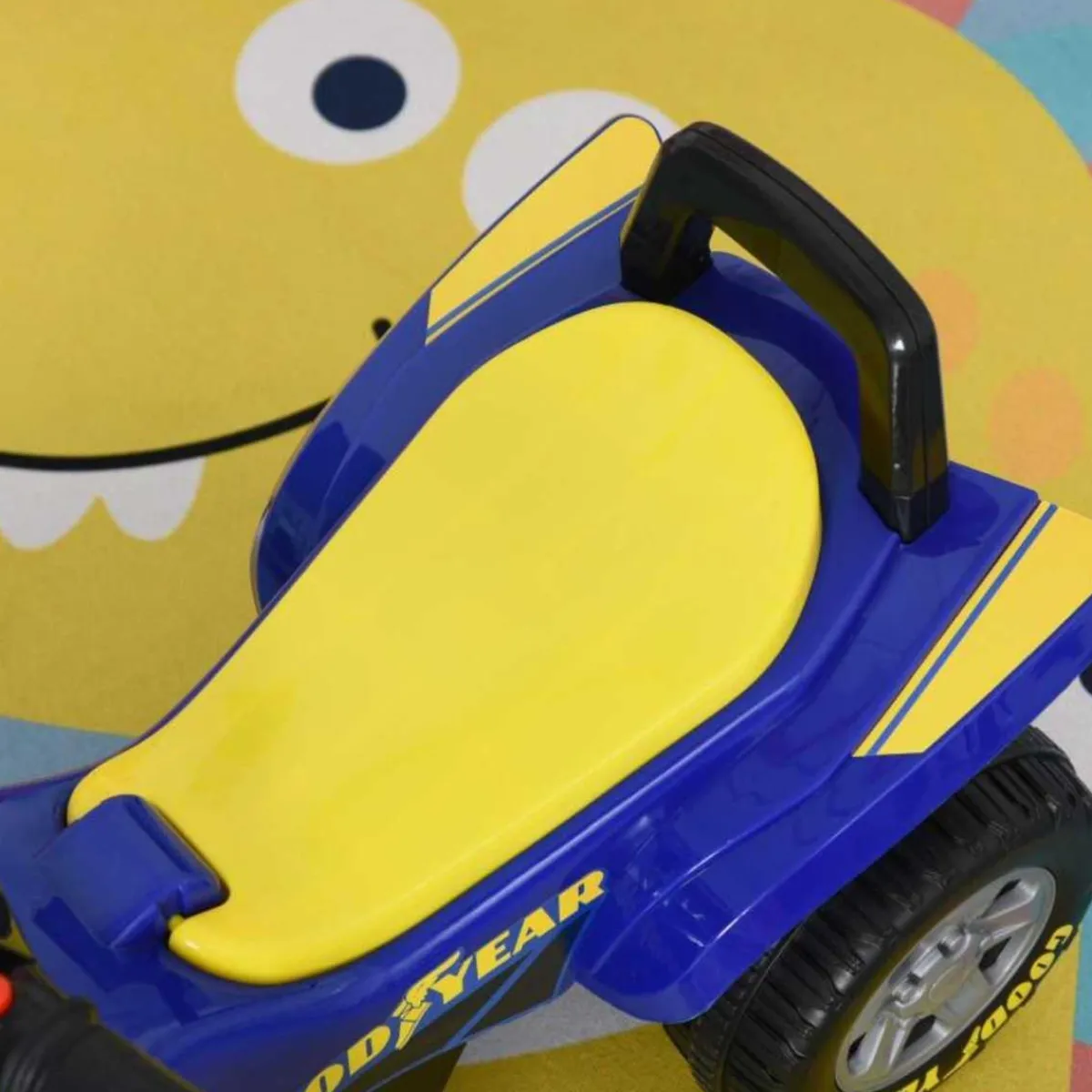 Para que cuando lo lleve un adulto también resulte cómodo, este quad para niños sin pedales con almacenaje y licencia de GOODYEAR, incorpora un asa en la parte trasera. Y no olvidemos que debajo de su asiento hay un compartimento secreto para guardar la merienda, juguetes o lo que queráis.