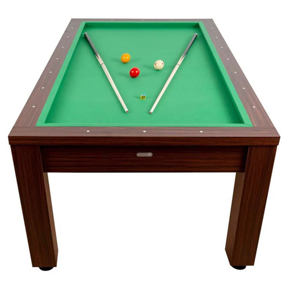 Mesa de billar de fácil montaje. La mesa viene montada a falta de atornillar las patas. La mesa está forrada con tapete de gran duración en color verde. Incorpora niveladores de patas.