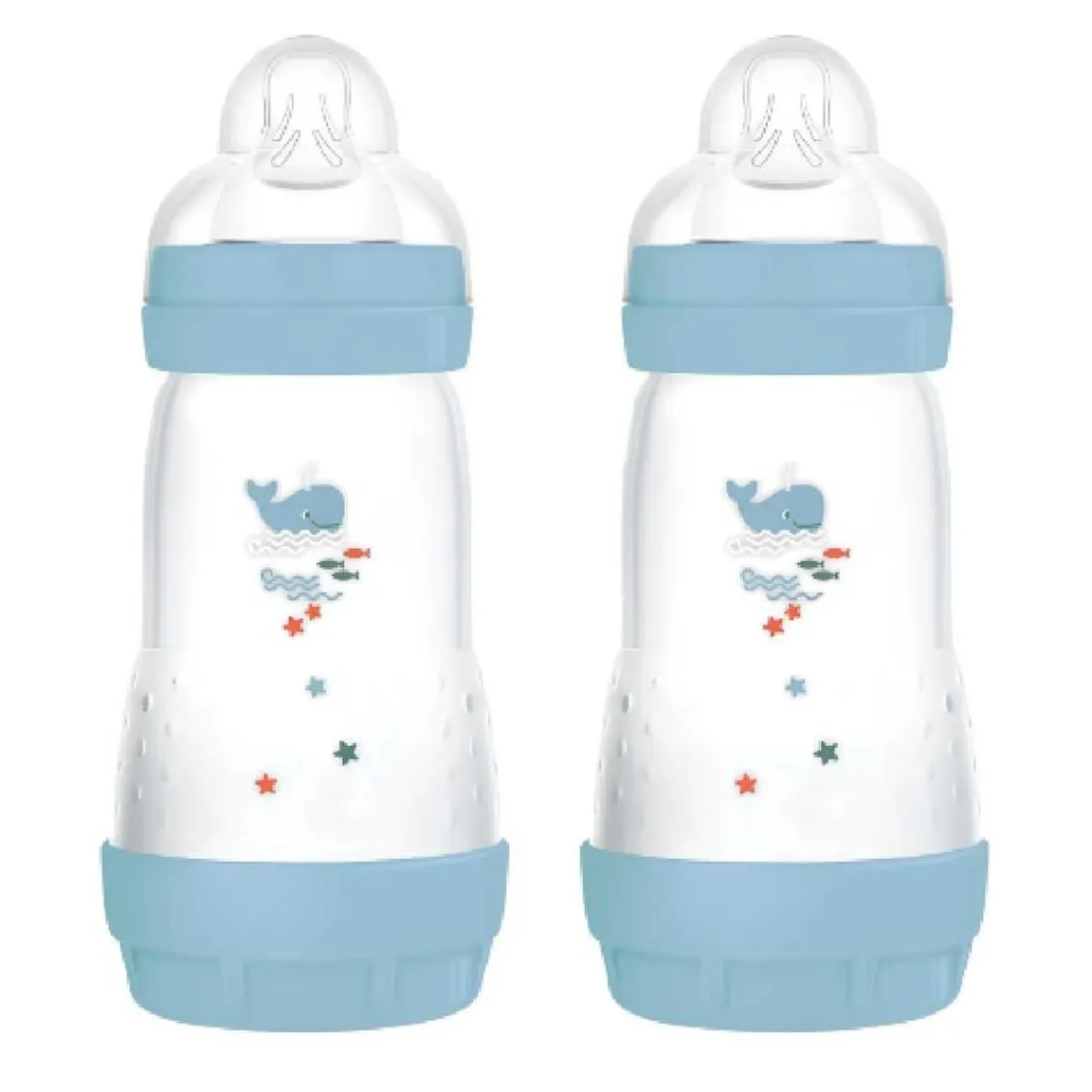 MAM – Conjunto 2 biberones Easy Active anticólicos 260 ml Azul, diseñados para ofrecer una alimentación cómoda y segura desde los primeros meses de vida.