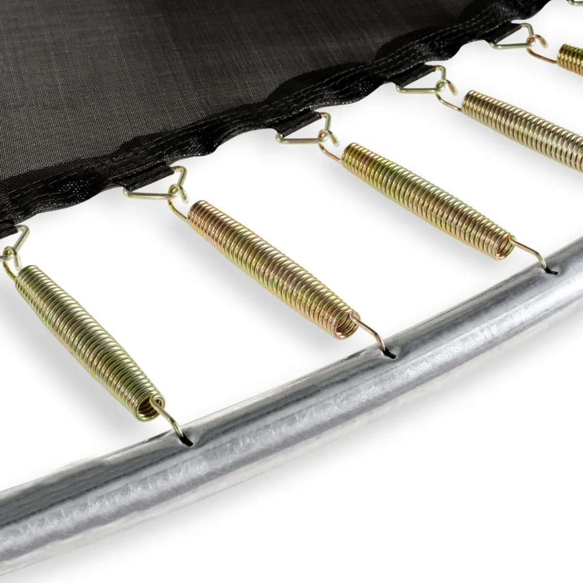 Gracias al sistema de protección para los pies (FPS) de Exit que interpone una red de protección entre la lona de salto y el acolchado del trampolín, los pies de la persona que está saltando nunca quedarán atrapados entre los muelles.