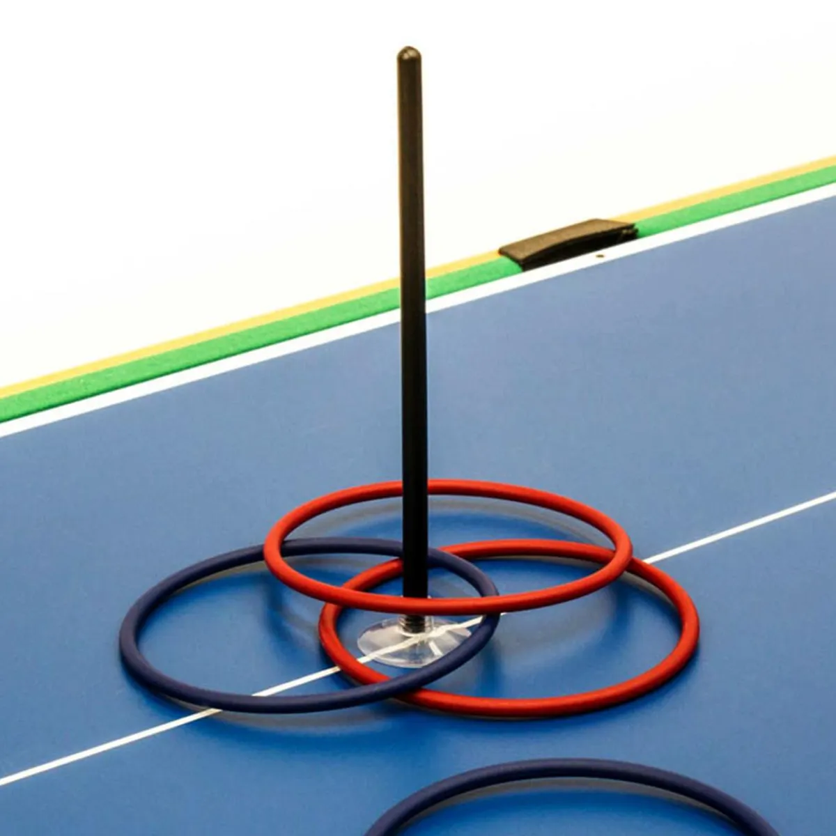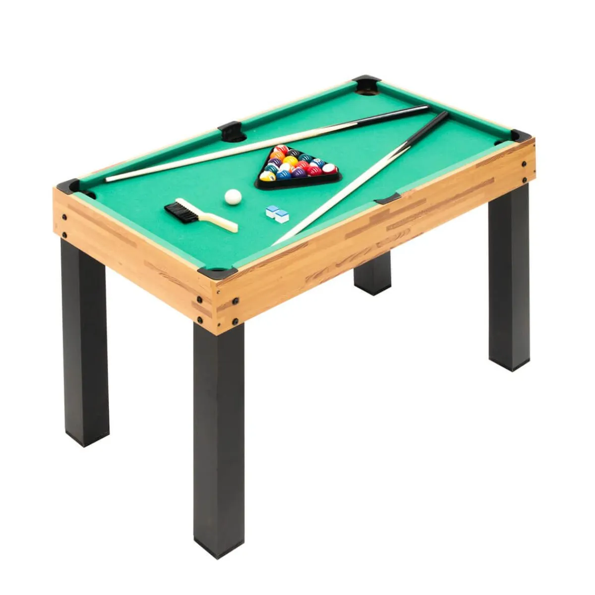 - Incluye: 2 tacos de billar, 1 juego de bolas (diámetro 3,8 cm), triángulo, cepillo, tiza, 2 bolas, 2 lanzadores, 2 discos, red, pelotas de ping pong, 2 palas de ping pong, 2 sticks, cartas, dados, fichas ajedrez, anillas, herraduras, bolos y fichas.