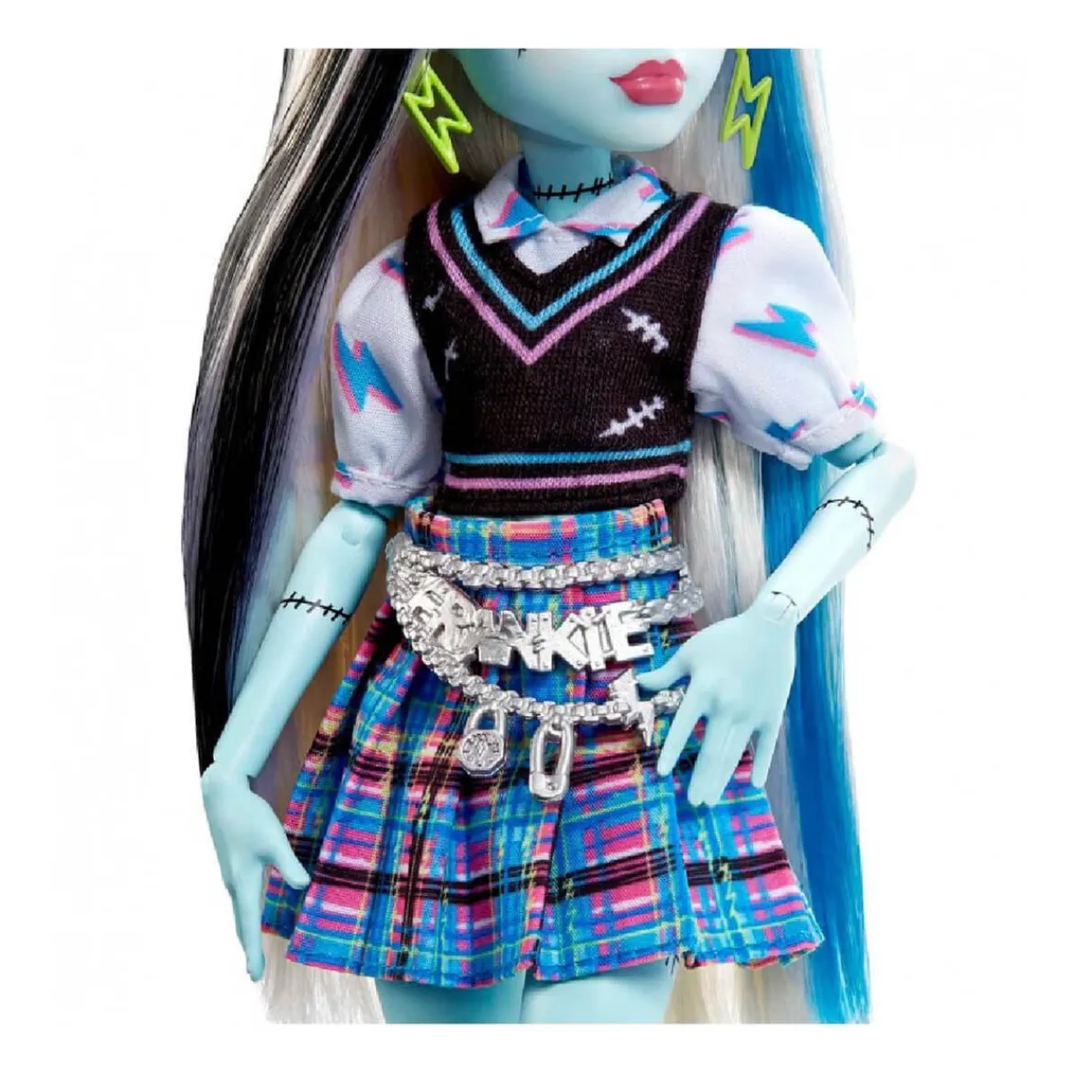 Monster High – Muñeca Frankie Stein, la muñeca Monster High de Frankie Stein con su conjunto azul eléctrico, accesorios y mascota.