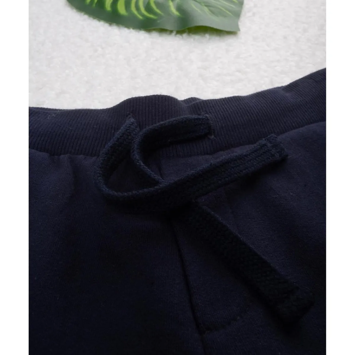 Estilo moderno en azul denim con rayas blancas decorativas. Pretina con cordón ajustable y bolsillos laterales profundos para guardar pequeños tesoros.