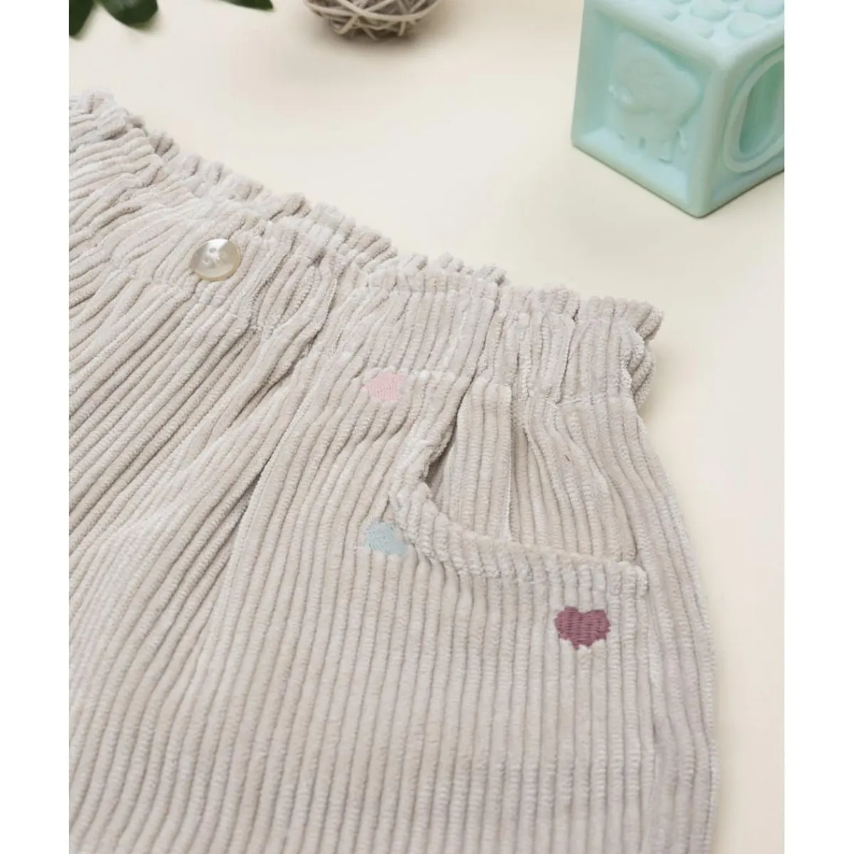 Estos shorts infantiles de pana en tono beige cuentan con bordados en forma de corazones a lo largo de los bolsillos laterales. La cintura elástica garantiza un ajuste cómodo, y un botón de madera frontal aporta un detalle decorativo encantador.