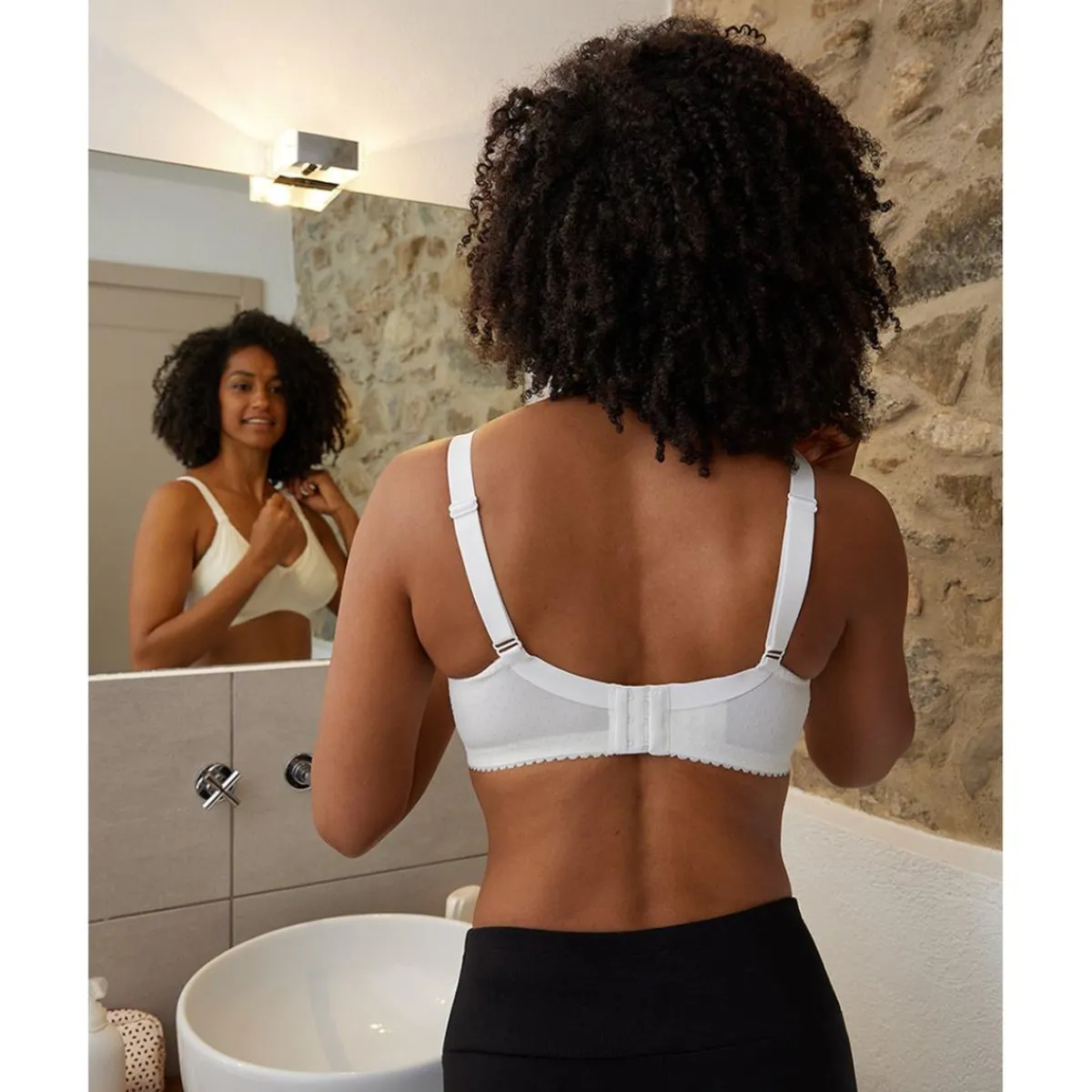 Sujetador de lactancia sin aros en jersey de algodón blanco, con copas desmontables y elástico debajo del pecho que garantiza el máximo apoyo y un confort óptimo. Con copas acolchadas y tirantes ajustables, el sujetador para nuevas mamás se adapta perfectamente a los cambios de talla y forma del pecho durante la fase de lactancia. El estampado de lunares realizado con hilos de lúrex en tono añade un toque juguetón y delicado.
