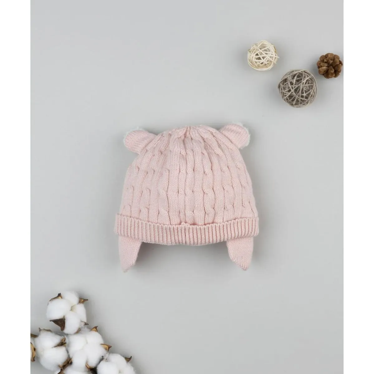 Este gorro infantil de punto en rosa pastel combina calidez y dulzura. Con diseño de orejitas aplicadas y cubreorejas integrados, protege eficazmente la cabeza y las orejas en los días fríos.