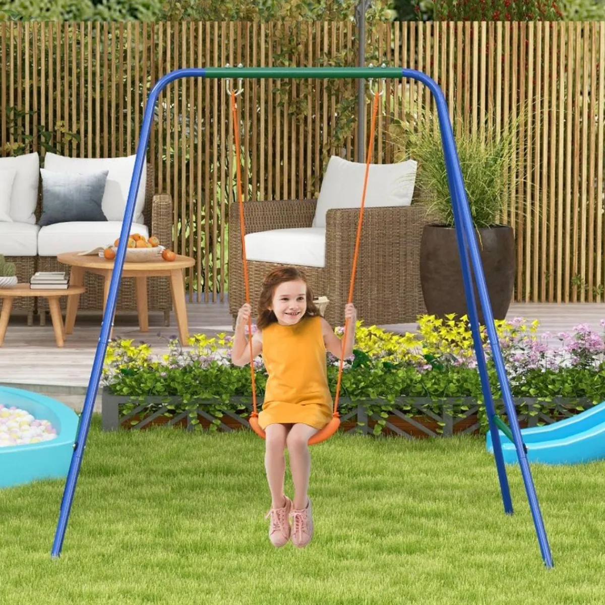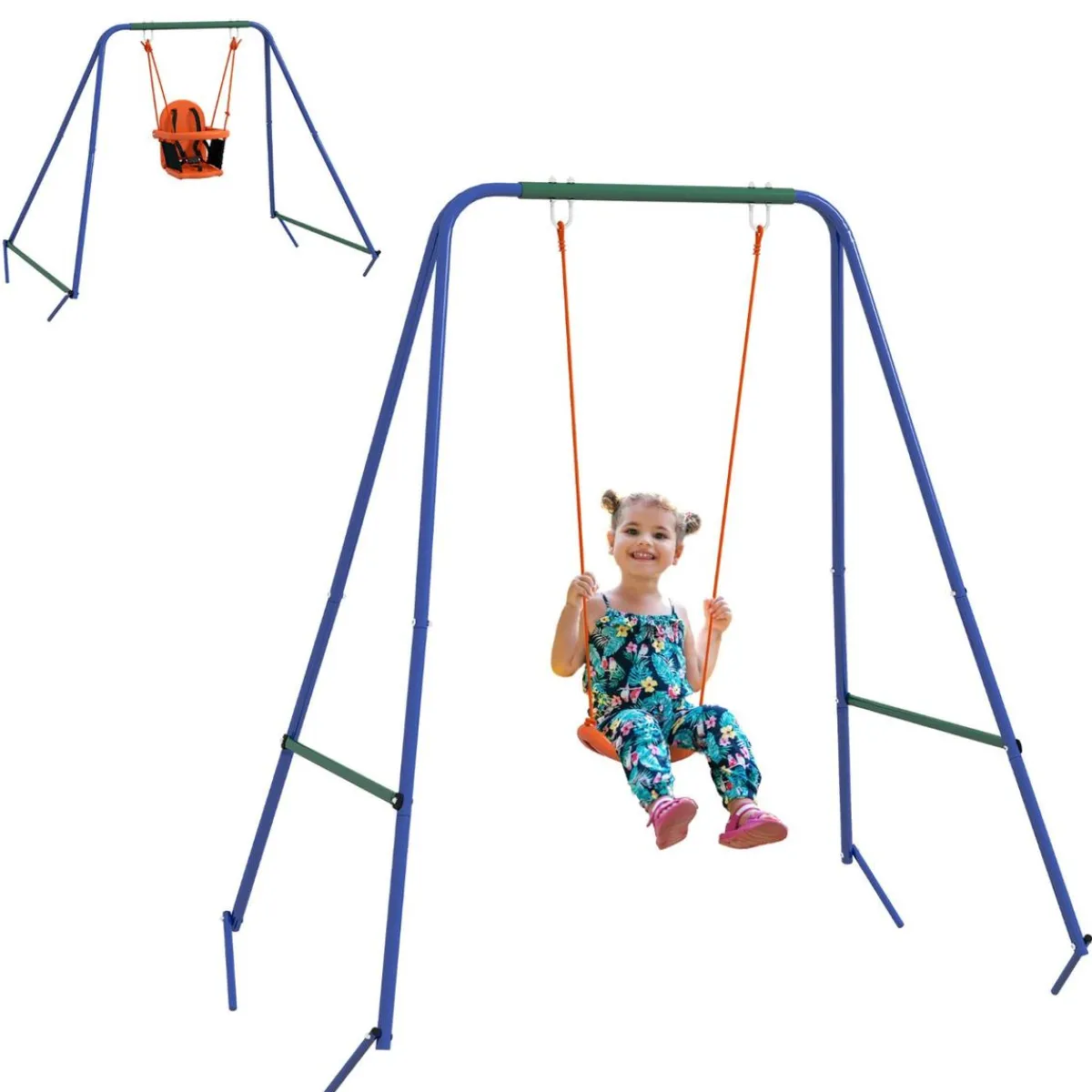 - Máxima estabilidad. Construido con materiales metálicos de alta resistencia y con un diseño de estructura en forma de A, este columpio para niños está construido para resistir el uso diario sin ningún temblor. Puede instalarse vertiendo cemento o insertándolo en el suelo, asegurando la máxima seguridad para los usuarios.