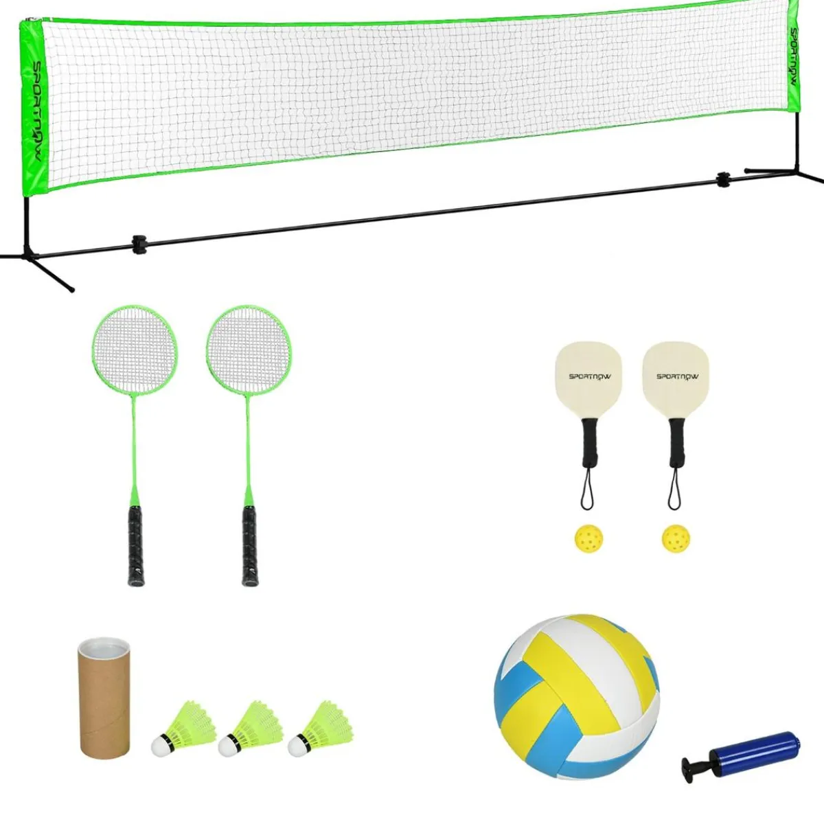 - Incluye 2 raquetas de bádminton, 3 volantes, 2 raquetas de pickleball, 2 pelotas de pickleball, 1 balón de voleibol, 1 red con soporte y 1 inflador.