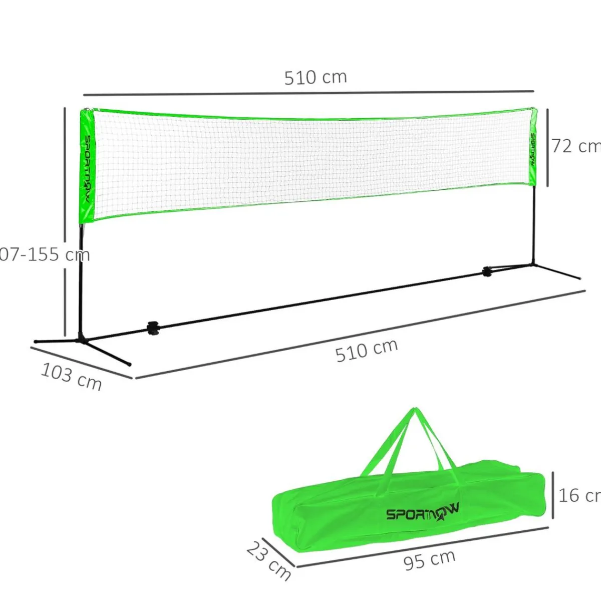 - Altura ajustable entre 107 y 155 cm para bádminton, pickleball y voleibol.