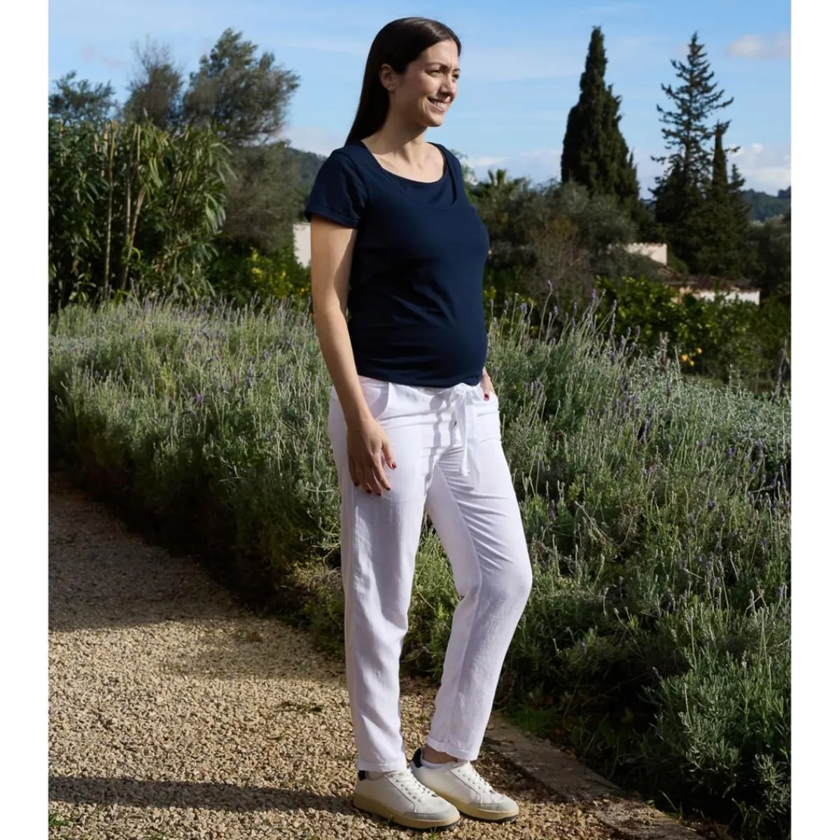 El diseño incluye un top interior fácil de levantar que permite amamantar a tu bebé de manera sencilla y discreta en cualquier momento. Además, gracias a la elasticidad del tejido, esta camiseta también puede ser utilizada durante el embarazo, adaptándose al crecimiento de la barriga.