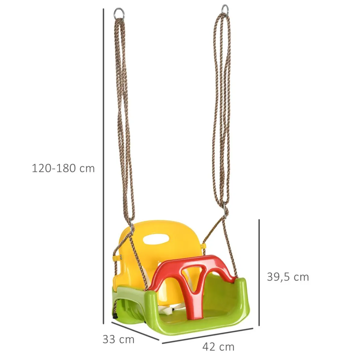 - Las cuerdas para colgar el columpio son ajustables en altura (1,2-1,8 m), para regular según el sitio donde se instale y si requiere medidas diferentes si se instala en un árbol.